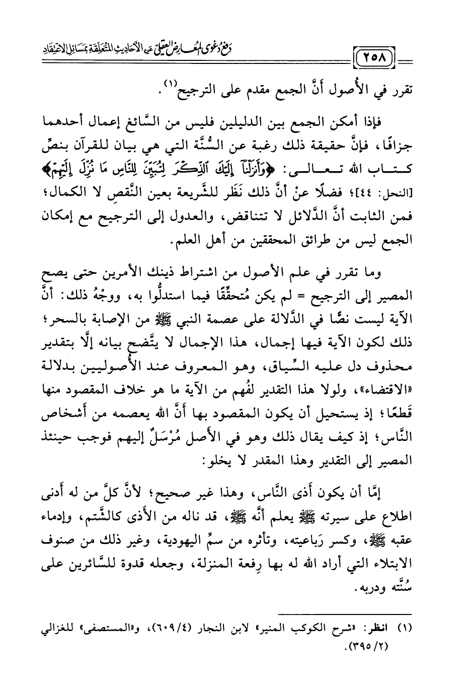وما تقرر في علم الأصول من اشتراط ذينك الأمرين حتى يصح المصير إلى الترّجيح =لم يكن مُتحقِّقًا فيما استدلُّوا به، و وجْهُ ذلك: أنَّ الآية ليست نصًّا في الدَّلالة على عصمة النبي - صلى الله عليه وسلم - من الإصابة بالسحر؛ ذلك لكون الآية فيها إجمال هذا الإجمال لا يتّضح بيانه إلَاّ بتقدير محذوف دل عليه السِّياق، وهو المعروف عند الأُصوليين بدلالة " الاقتضاء"، ولولا هذا التقدير لفُهم من الآية ما هو خلاف المقصود منها قَطعًا؛ إذ يستحيل أن يكون المقصود بها أَنَّ الله يعصمه من أَشخاص النَّاس؛ إذ كيف يقال ذلك وهو في الأَصل مُرْسَلٌ إليهم فوجب حينئذ المصير إلى التقدير وهذا المقدر لا يخلو:
