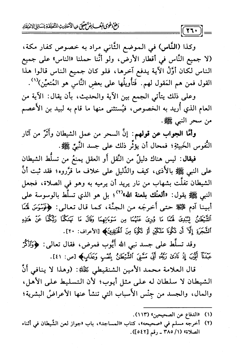 فيقال: ليس هناك دليلٌ من النَّقل أَو العقل يمنعُ من تسلّط الشيطان على النبي - صلى الله عليه وسلم - بالأَذى، كيف والدّليل على خلاف ما قرَّروه؛ فقد ثبت أنَّ الشيطان تفلّت بشهاب من نار يريد أن يرميه به وهو في الصلاة، فجعل النبي - صلى الله عليه وسلم - يقول: (ألعنُك بلعنة الله) (¬٢)؛ بل هو الذي تسلَّط بالوسوسة على أبينا آدم - عليه السلام - حتى أَخرجَه من الجنَّة، كماقال تعالى: {فَوَسْوَسَ لَهُمَا الشَّيْطَانُ لِيُبْدِيَ لَهُمَا مَا وُورِيَ عَنْهُمَا مِنْ سَوْآتِهِمَا وَقَالَ مَا نَهَاكُمَا رَبُّكُمَا عَنْ هَذِهِ الشَّجَرَةِ إِلَّا أَنْ تَكُونَا مَلَكَيْنِ أَوْ تَكُونَا مِنَ الْخَالِدِينَ (٢٠)} الأعراف.