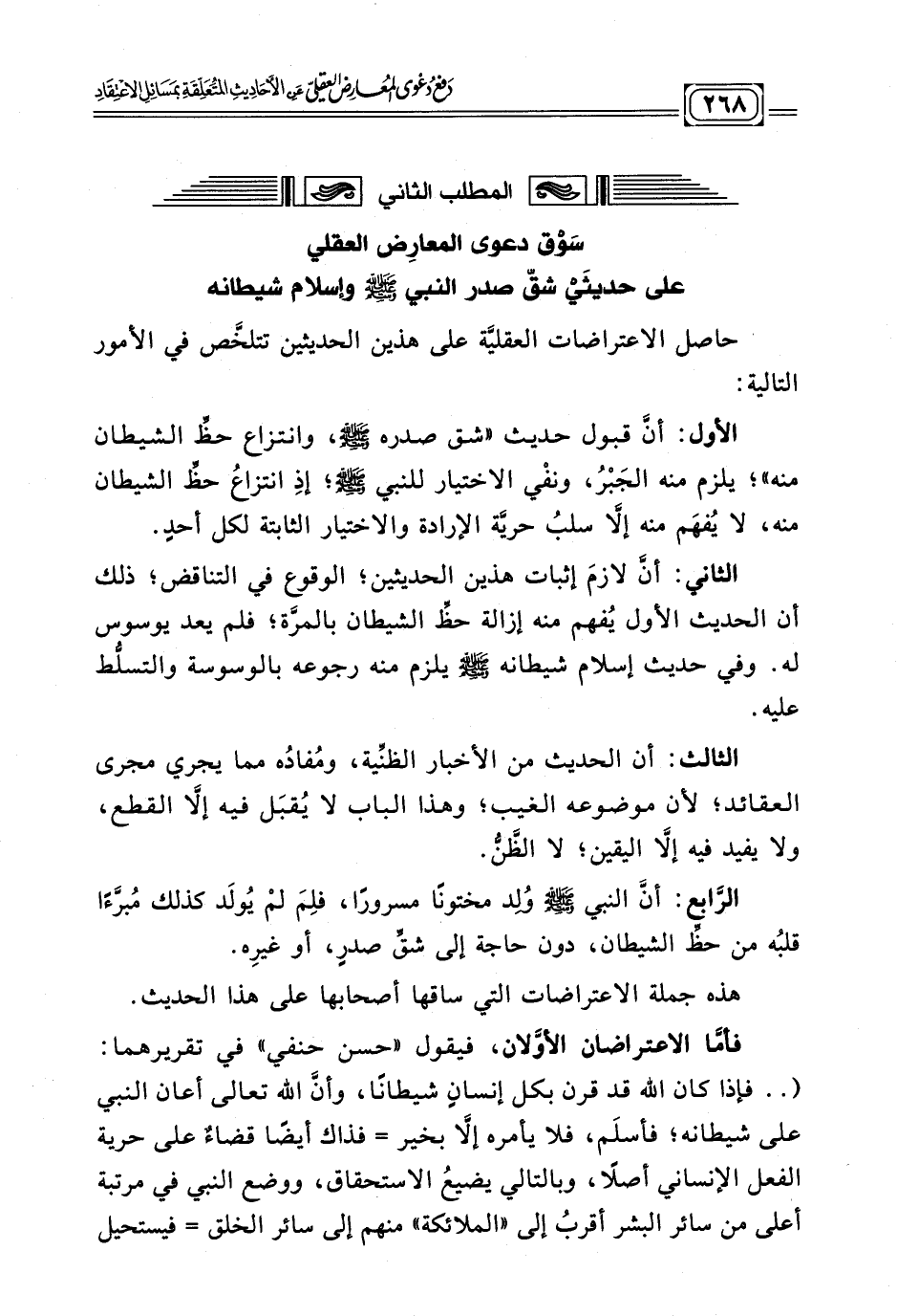 المطلب الثاني: سَوْق دعوى المعارِض العقلي على حديثَيْ شقّ صدر النبي - صلى الله عليه وسلم - وإسلام شيطانه.
