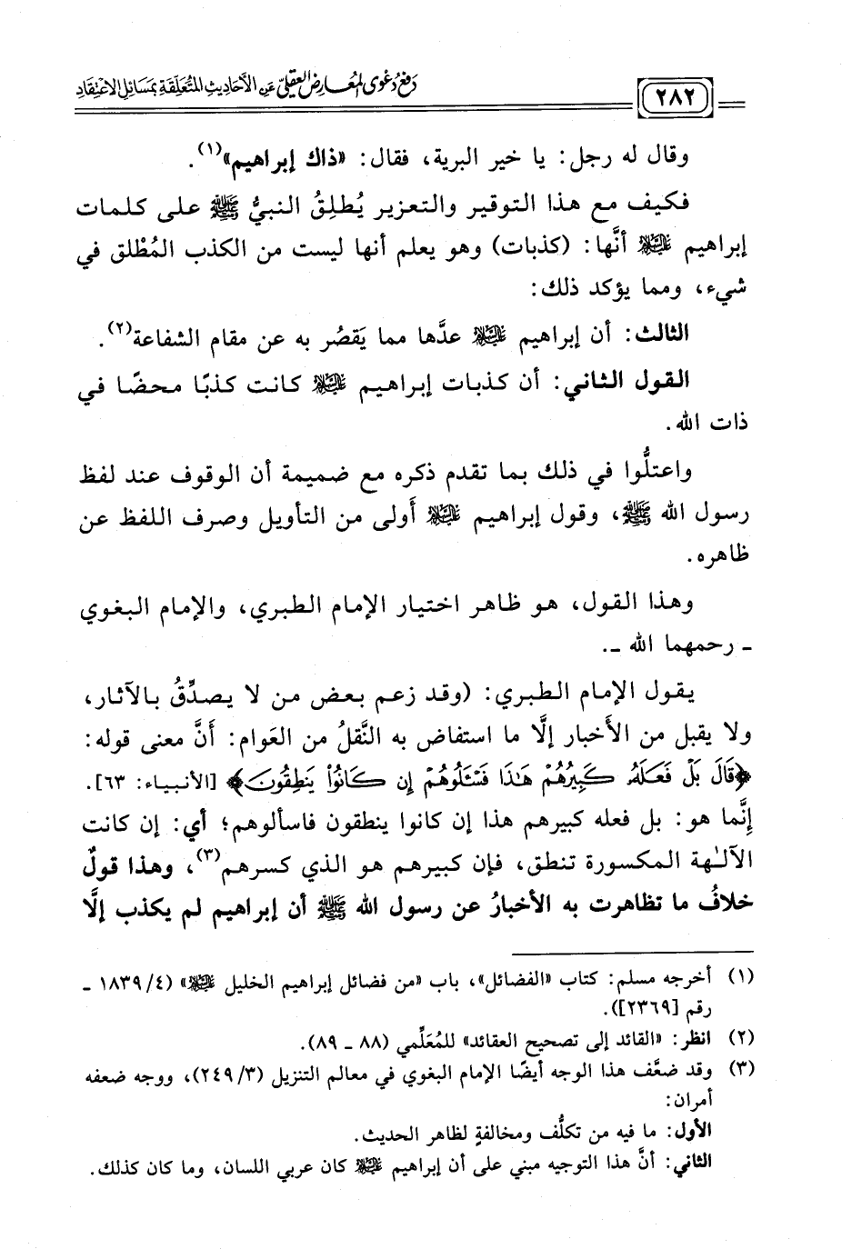واعتلّوا في ذلك بما تقدم ذكره بالإضافة إلى أن الوقوف عند لفظ رسول الله - صلى الله عليه وسلم - وقول إبراهيم - عليه السلام - أَولى من التأويل وصرف اللفظ عن ظاهره.