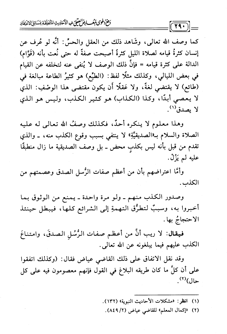 وقد نقل الاتفاق على ذلك القاضي عياض فقال: (وكذلك اتفقوا على أن كلَّ ما كان طريقه البلاغ في القول فإنهم معصومون فيه على كل حال) . (¬٢)