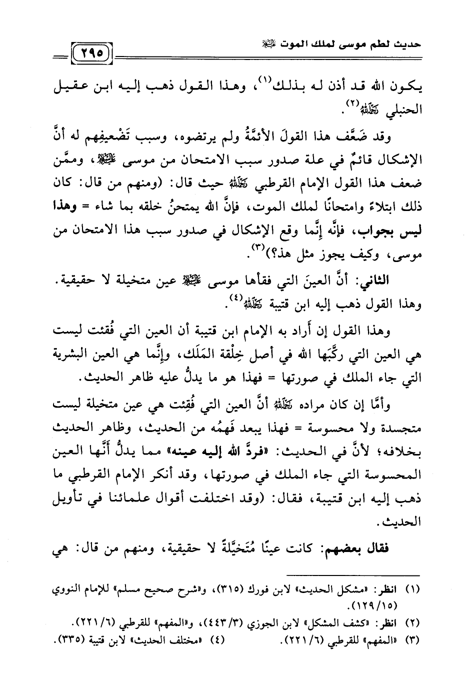 وأمَّا إن كان مراده - رحمه الله - أنَّ العين التي فُقِأت هي عين متخيله ليست متجسدة ولا محسوسة = فهذا يبعد فَهمُه من الحديث، وظاهر الحديث بخلافه؛ لأنَّ في الحديث (فردَّ الله إليه عينه) مما يدلُّ أَنَّها العين المحسوسة التي جاء الملك في صورتها، وقد أنكر الإمام القرطبي ما ذهب إليه ابن قتيبة، فقال: (وقد اختلفت أقوال علمائنا في تأويل الحديث.