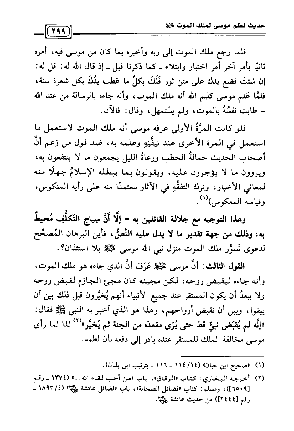 القول الثالث: أنَّ موسى - عليه السلام - عَرَفَ أنَّ الذي جاءه هو ملك الموت، وأنه جاءه ليقبض روحه، لكن مجيئه كان مجئ الجازم لقبض روحه و لا يبعدُ أن يكون المستقر عند جمع الأنبياء أنهم يُخيَّرون قبل ذلك بين أن يبقوا، وبين أن تقبض أرواحهم، وهذا هو الذي أخبر به النبي - صلى الله عليه وسلم - فقال: (إنَّه لم يُقبض نبي قط حتى يرى مقعده من الجنة ثم يُخيَّر) (¬٢) لذا لما رأى موسى مخالفة الملك للمستقر عنده بادر إلى دفعه بأن لطمه.