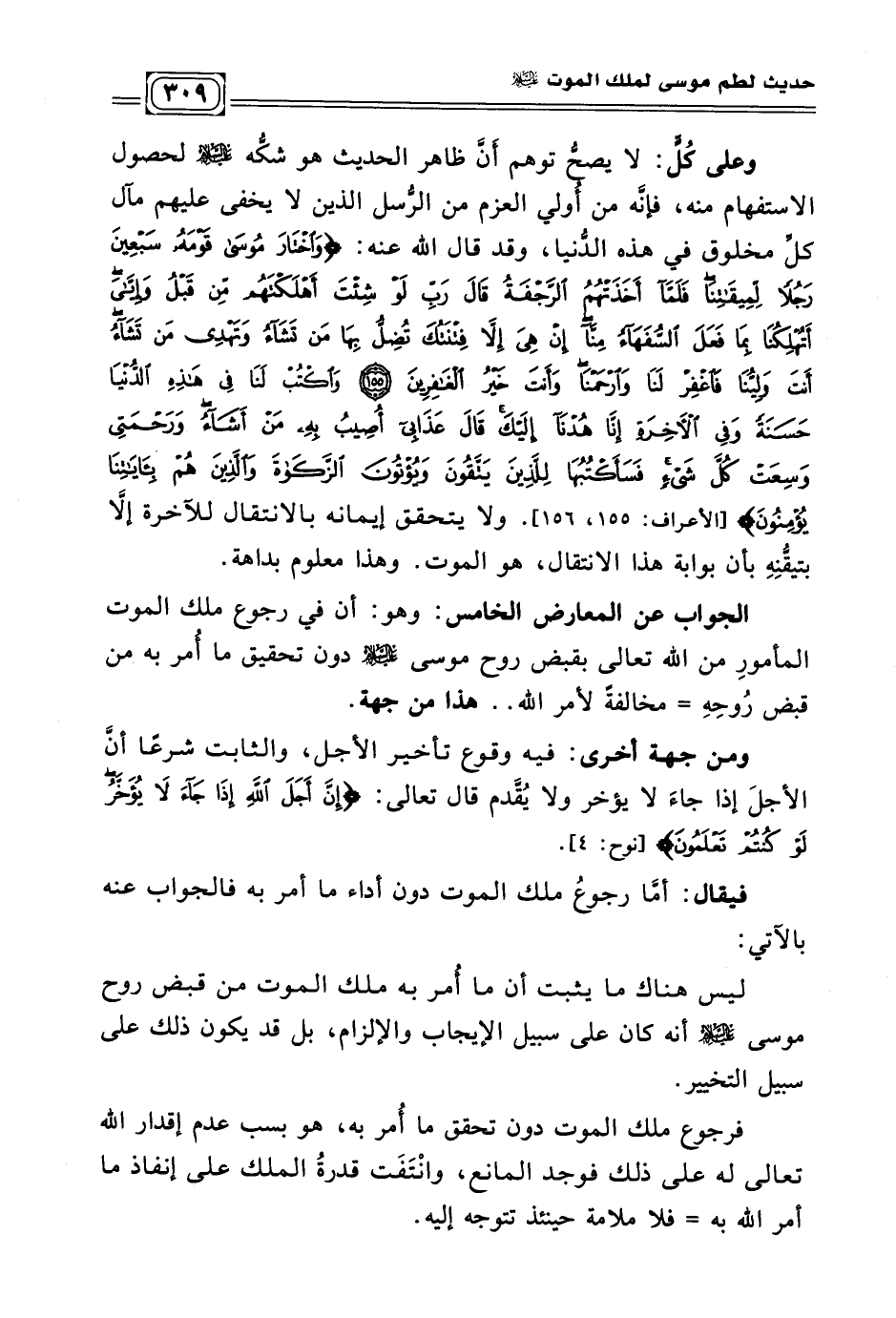 الجواب عن المعارض الخامس: وهو: أن في رجوع ملك الموت المأمور من الله تعالى بقبض روح موسى عليه السلام دون تحقيق ما أُمر به من قبض رُوحِهِ = مخالفة لأمر الله .. هذا من جهة.