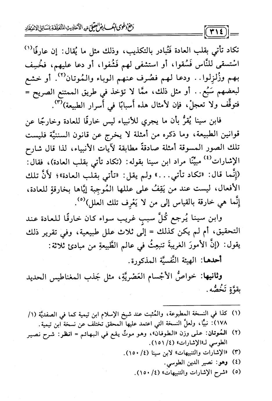 فابن سينا يُقرُّ بأن ما يجري للأنبياء ليس خارقًا للعادة وخارجا عن قوانين الطبيعة، وما ذكره من أمثلة لا يخرج عن قانون السننيَّة فليست تلك الصور المسوقة أمثلة صادقةً مطابقة لآيات الأنبياء، لذا قال شارح الإشارات (¬٤) مبيِّنًا مراد ابن سينا بقوله: (تكاد تأتي بقلب العادة)، فقال: (إِنَّما قال "تكاد تأتي ... " ولم يقل: "تأتي بقلب العادة"؛ لأَنَّ تلك الأفعال، ليست عند من يَقِفُ على عللها المُوجِبة إيَّاها بخارقةٍ للعادة، إِنَّما هي خارقة بالقياس إلى من لا يَعْرِف تلك العلل) (¬٥)