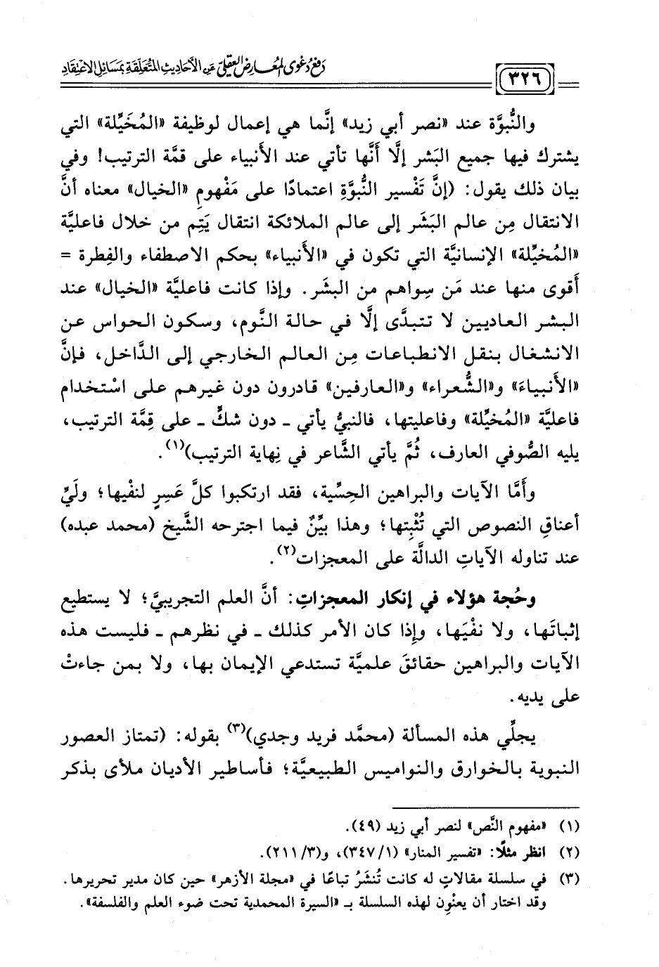 والنُّبوَّة عند "نصر أَبي زيد"إنَّما هي إعمال لوظيفة "المُخَيِّلة"التي يشترك فيها جميع البَشر إلَّا أَنَّها تأتي عند الأَنبياء على قمَّة الترتيب! وفي بيان ذلك يقول: (إنَّ تَفْسير النّبوَّةِ اعتمادًا على مَفْهومِ "الخيال" معناه أنَّ الانتقال مِن عالم البَشَر إلى عالم الملائكة انتقال يَتِم من خلال فاعليَّة "المُخيِّلة"الإنسانيَّة التي تكون في "الأَنبياء" بحكم الاصطفاء والفِطرة =أَقوى منها عند مَن سِواهم من البشَر. وإذا كانت فاعليَّة "الخيال"عند البشر العاديين لا تتبدَّى إلَّا في حالة النَّوم، وسكون الحواس عن الانشغال بنقل الانطباعات مِن العالم الخارجي إلى الدَّاخل، فإنَّ "الأَنبياءَ" و"الشُّعراء" و"العارفين" قادرون دون غيرهم على اسْتخدام فاعليَّة "المُخيَّلة"وفاعليتها، فالنبيُّ يأتي -دون شكٍّ- على قِمَّة الترتيب، يليه الصُّوفي العارف، ثُمَّ يأتي الشَّاعر في نِهاية الترتيب) (¬١)