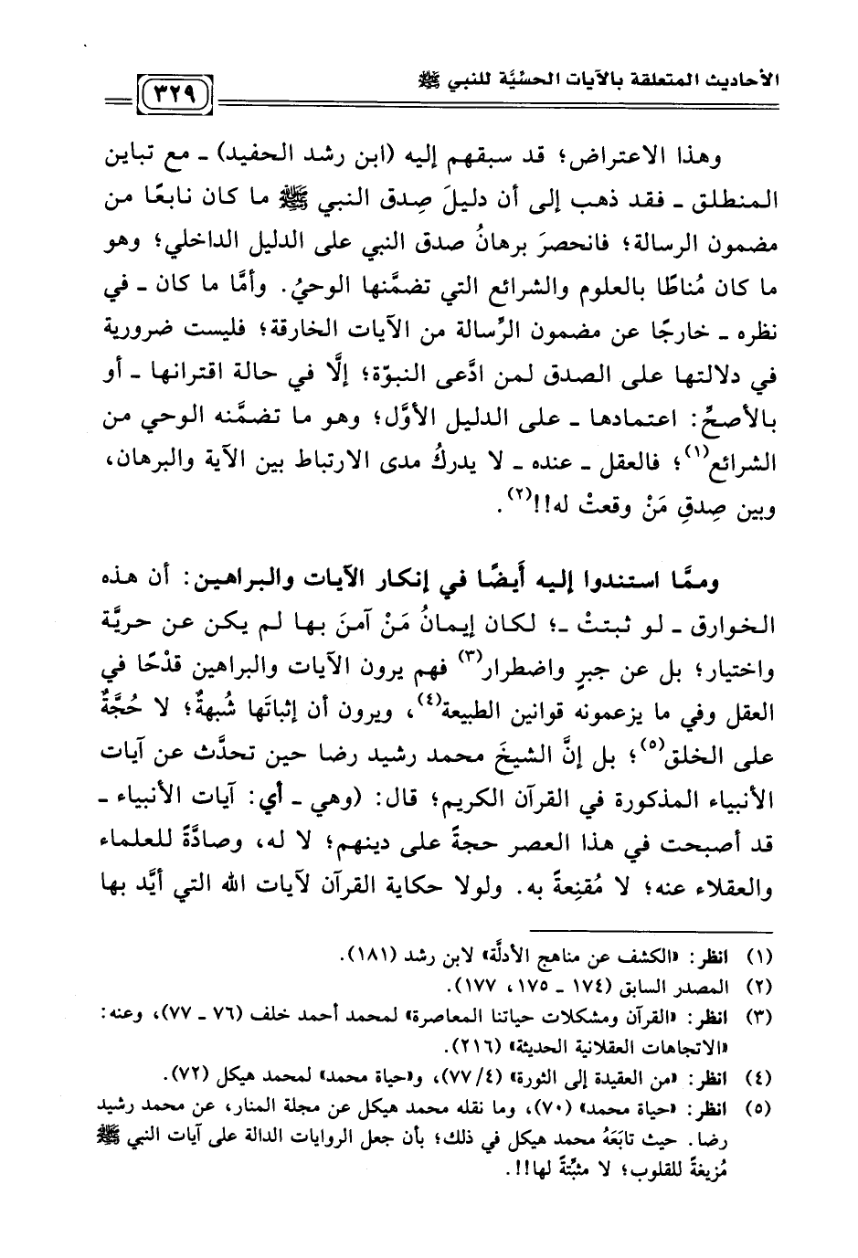 (¬٥) انظر: " حياة محمد " (٧٠)، وما نقله محمد هيكل عن مجلة المنار، عن محمد رشيد رضا. حيث تابَعَهُ محمد هيكل في ذلك؛ بأن جعل الروايات الدالة على آيات النبي - صلى الله عليه وسلم - مُزيغةً للقلوب؛ لا مثبّتةً لها!!