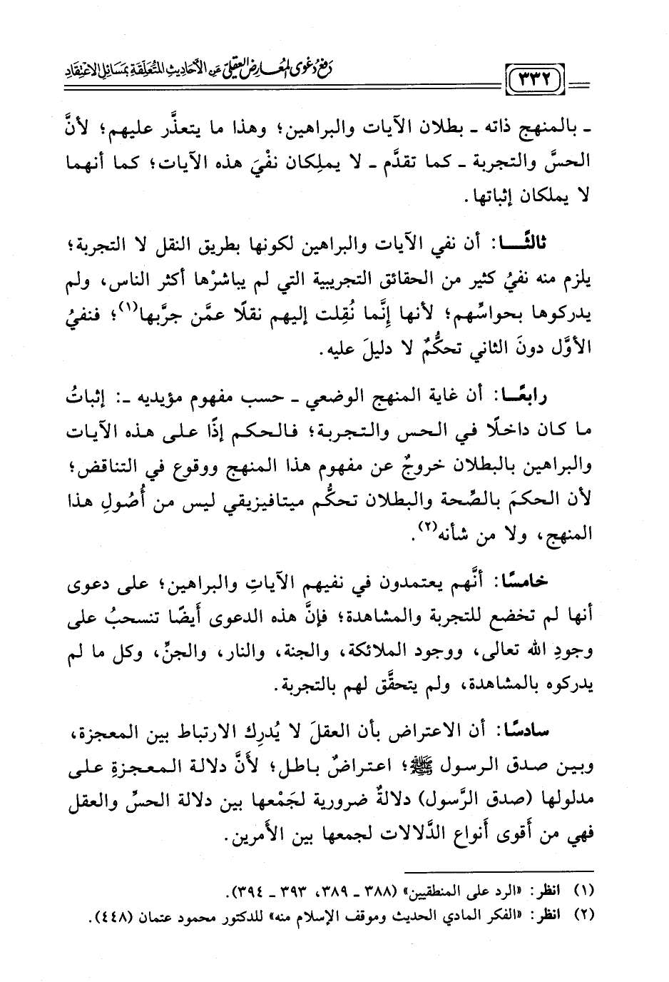 - بالمنهج ذاته - بطلان الآيات والبراهين؛ وهذا ما يتعذّر عليهم؛ لأنّ الحسّ والتجربة - كما تقدّم - لا يملكان نفْيَ هذه الآيات؛ كما أنهما لا يملكان إثباتها.
