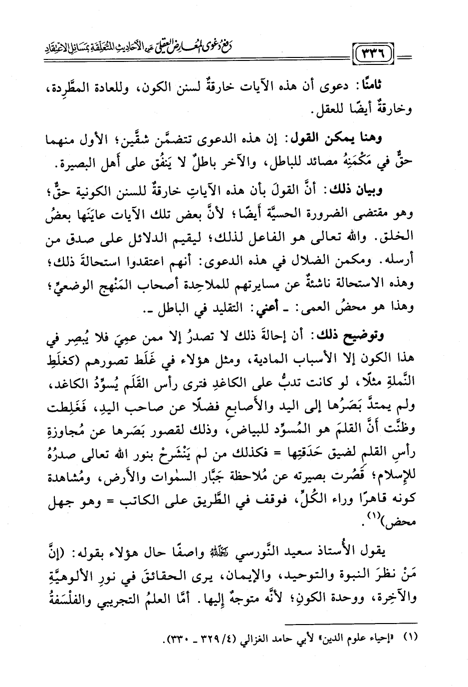 يقول الشيخ سعيد النَّورسي - رحمه الله - واصفًا حال هؤلاء بقوله: «إنَّ مَنْ نظرَ النبوةِ والتوحيد، والإيمان، يرى الحقائقَ في نورِ الألوهيَّةِ والآخِرة، ووحدة الكونِ؛ لأنّه متوجهٌ إِليها. أمَّا العلمُ التجريبي والفلْسَفةُ