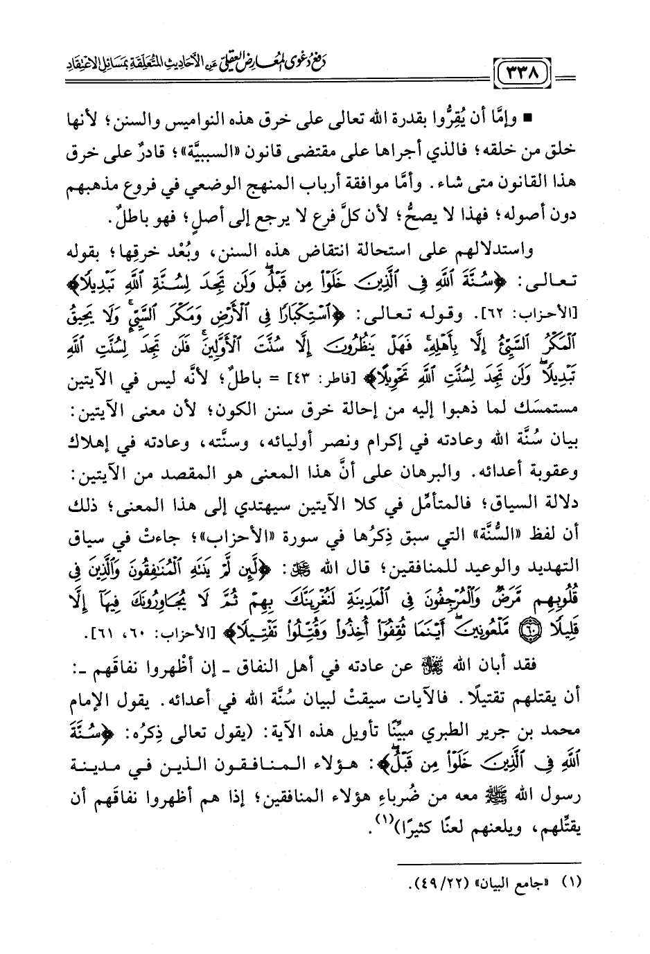 واستدلالهم على استحالة انتقاض هذه السنن، وبُعْد خرقِها؛ بقوله تعالى: {سُنَّةَ اللَّهِ فِي الَّذِينَ خَلَوْا مِنْ قَبْلُ وَلَنْ تَجِدَ لِسُنَّةِ اللَّهِ تَبْدِيلًا (٦٢)} الأحزاب. وقوله تعالى: {اسْتِكْبَارًا فِي الْأَرْضِ وَمَكْرَ السَّيِّئِ وَلَا يَحِيقُ الْمَكْرُ السَّيِّئُ إِلَّا بِأَهْلِهِ فَهَلْ يَنْظُرُونَ إِلَّا سُنَّتَ الْأَوَّلِينَ فَلَنْ تَجِدَ لِسُنَّتِ اللَّهِ تَبْدِيلًا وَلَنْ تَجِدَ لِسُنَّتِ اللَّهِ تَحْوِيلًا (٤٣)} فاطر.=باطلٌ لأنَّه ليس في الآية مستمسَك لما ذهبوا إليه من إحالة خرق سنن الكون؛ لأن معنى الآيتين: بيان سنة الله وعادته في إكرام، ونصر أوليائه، وسنّتُه، وعادتُه في إهلاك وعقوبة أعدائه. والبرهان على أنّ هذا المعنى هو المقصد من الآيتين: دلالة السياق؛ فالمتأمّل في كلا الآيتين سيهتدي إلى هذا المعنى؛ ذلك أن لفظ " السُّنَّة " التي سبق ذِكرُها في سورة " الأحزاب "؛ جاءتْ في سياق التهديد والوعيد للمنافقين؛ قال الله - عز وجل -: {لَئِنْ لَمْ يَنْتَهِ الْمُنَافِقُونَ وَالَّذِينَ فِي قُلُوبِهِمْ مَرَضٌ وَالْمُرْجِفُونَ فِي الْمَدِينَةِ لَنُغْرِيَنَّكَ بِهِمْ ثُمَّ لَا يُجَاوِرُونَكَ فِيهَا إِلَّا قَلِيلًا (٦٠) مَلْعُونِينَ أَيْنَمَا ثُقِفُوا أُخِذُوا وَقُتِّلُوا تَقْتِيلًا (٦١) سُنَّةَ اللَّهِ فِي الَّذِينَ خَلَوْا مِنْ قَبْلُ وَلَنْ تَجِدَ لِسُنَّةِ اللَّهِ تَبْدِيلًا (٦٢)} الأحزاب.