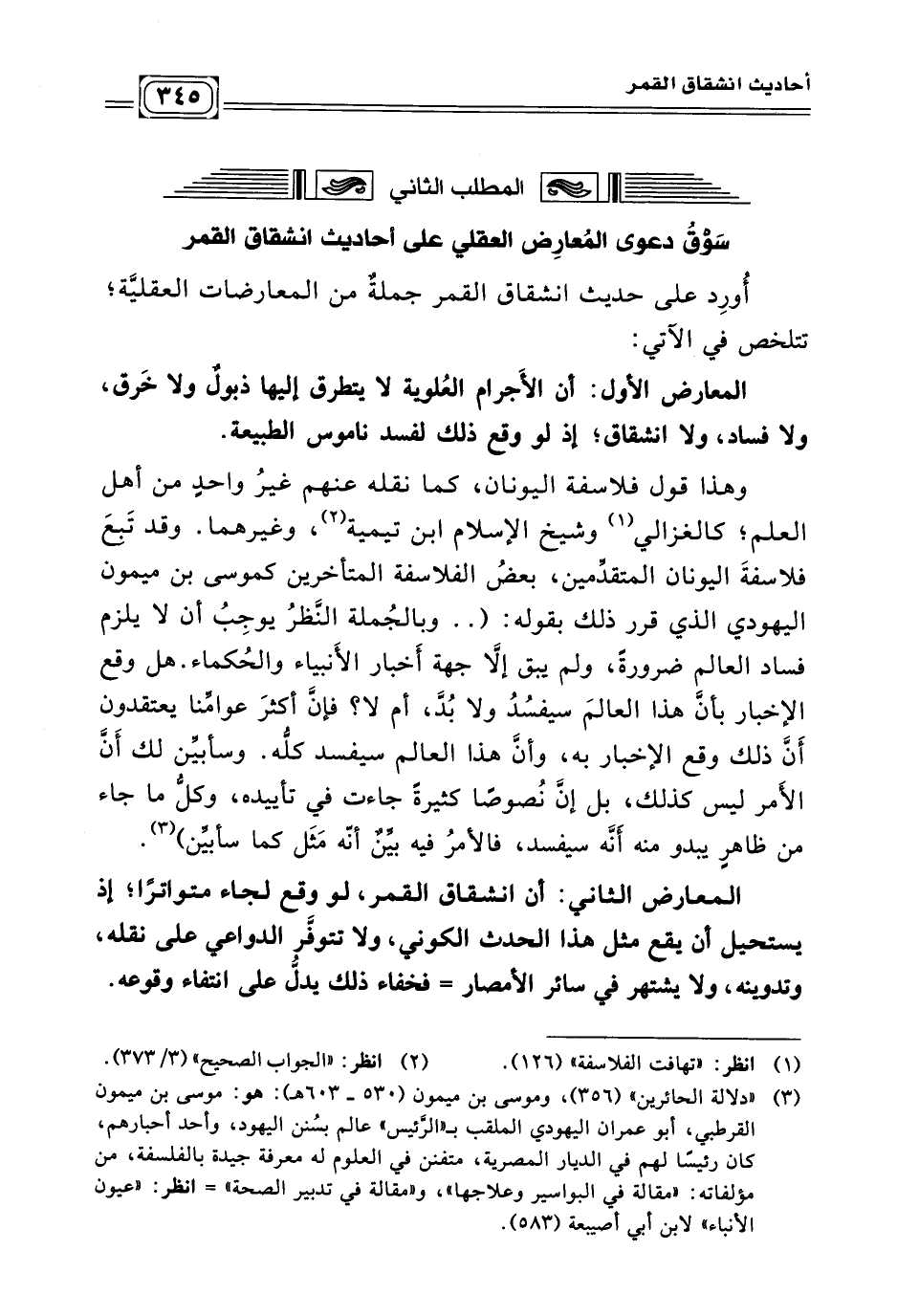 (¬٣) "دلالة الحائرين" (٣٥٦) وموسى بن ميمون (٥٣٠ - ٦٠٣ هـ): هو موسى بن ميمون القرطبي، أبو عمران اليهودي الملقب بـ"الرَّئيس" عالم بسُنن اليهود، وأحد أحبارهم، كان رئيسًا لهم في الديار المصرية، متفنن في العلوم له معرفة جيدة بالفلسفة، من مؤلفاته "مقالة في البواسير وعلاجها"، و "مقالة في تدبير الصحة"=انظر: "عيون الأنباء "لابن أبي أصيبعة (٥٨٣)