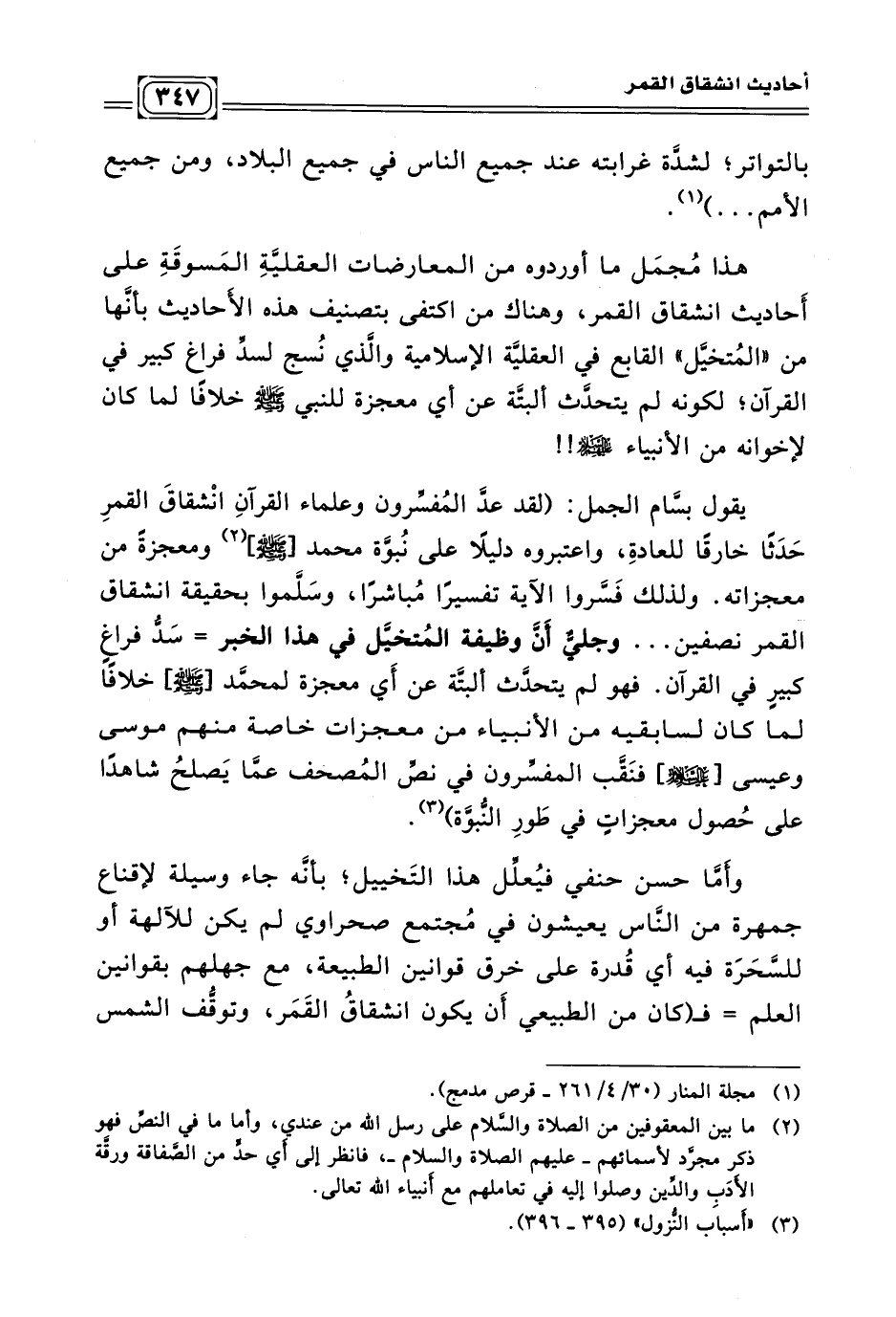 يقول بسَّام الجمل: (لقد عدَّ المُفسِّرون وعلماء القرآنِ انْشِّقاقَ القمرِ حَدَثًا خارقًا للعادةِ، واعتبروه دليلًا على نُبوّة محمد [- صلى الله عليه وسلم -] (¬٢) ومعجزةً من معجزاته. ولذلك فَسّروا الآية تفسيرًا مُباشرًا، وسَلَّموا بحقيقة انشقاق القمر نصفين ... وجليٌّ أَنَّ وظيفة المُتخيَّل في هذا الخبر =سَدُّ فراغٍ كبيرٍ في القرآن. فهو لم يتحدَّث الَّبتَّة عن أَي معجزة لمحمّد [- صلى الله عليه وسلم -] خلافًا لما كان لسابقيه من الأنبياء من معجزات خاصة منهم موسى وعيسى [عليهما السلام] فنَقَّب المفسِّرون في نصِّ المُصحف عمَّا يَصلحُ شاهدًا على حُصول معجزاتٍ في طَورِ النُّبوّة) (¬٣)