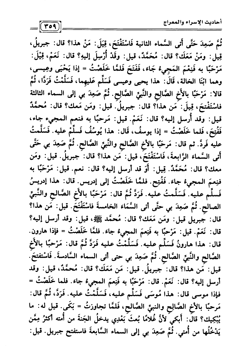قيل: مَن هذا؟ قال: جبريل قيل: ومَن مَعَك؟ قال: مُحمَّد - صلى الله عليه وسلم - قيل: وقد أرسل إليه؟ قال: نَعَمْ. قيل: مَرْحبًا به فَنِعمَ المجيءُ جاءَ. فلمَّا خَلَصْتُ= فإذا هارون. قال: هذا هارونُ فَسَلِّم عليه. فَسَلَّمْتُ عليه فَرَدَّ ثُمَّ قال: مَرْحبا بالأَخِ الصَّالحِ والنَّبيِّ الصّالحِ. ثُمَّ صَعِدَ بي حتى أتى السماء السَّادسةَ. فَاسْتفتحَ. قيل: مَن هذا؟ قال: جبريلُ. قيل: مَن مَعَكَ؟ قال: مُحمَّدٌ، قيل: وقد أرسل إليه؟ قال: نَعَمْ. قال: مَرْحَبَا به فَنِعمَ المجيءُ جاءَ. فلما خَلَصْتُ= فإذا موسى قال: هذا مُوسَى فَسَلِّم عليه فَسَلَّمْتُ عليه. فَرَدَّ، ثُمَّ قال: مَرحبًا بالأخِ الصَّالِحِ والنبيِّ الصَّالحِ فَلمَّا تجاوزتُ= بَكَى. قيل له: ما يُبْكِيك؟ قال: أَبكي لأنَّ غُلامًا بُعثَ بَعْدِي يدخلُ الجَنةَ من أُمته أكثرُ مِمَّن يَدْخُلُها من أُمتي. ثُمَّ صَعد بي إلى السماء السَّابعةَ فاستفتح جبريل. قيل: