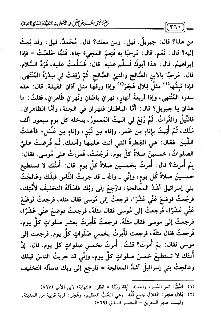 قال: هذه سدرة المُنْتهى، وإذا أربعةُ أَنهارٍ نهرانِ باطنانِ ونَهرانِ ظَاهرانِ، فقلتُ ما هذان يا جبريل؟ قال: أَمَّا الباطنان فنهران في الجنة، وأمَّا الظاهران: فالنِّيلُ والفُراتُ. ثُمّ رُفِعَ لي البيتُ المَعمورُ يدخله كل يومٍ سبعون ألف مَلَك، ثُمّ أُتِيتُ بإِناءٍ مِن خَمر، وإناء مِن لَبَنٍ، وإناءٍ مِن عَسَل؛ فأخذتُ اللّبنَ. فقال: هي الفِطرةُ التي أنت عليها وأمتك. ثُم فُرضتْ عليَّ الصلواتُ خمسينَ صلاةً كلَّ يوم فَرجعتُ فَمررتُ على مُوسى. فقال: بِمَ أُمرتَ؟ قال: أُمرتُ بخمسين صلاةً كلّ يوم قال: أُمتُك لا تستطيع خمسينَ صلاةً كُل يومٍ، وإنِّي -والله- قد جربتُ النَّاس قبلَك وعَالجْتُ بني إسرائيل أشَدَّ المعالجةِ فارْجِعْ إلى ربِّك فاسْألهُ التخفيفَ لأُمَّتِك فرجعتُ فوضعَ عَنِّي عَشْرًا، فرجعتُ إلى مُوسى فقال مثله، فرجعتُ فَوضَعَ عَنِّي عَشْرًا فَرجعتُ إلى مُوسى فقال مثلَهُ، فرجعتُ فوضعَ عنِّي عَشْرًا، فرجعتُ إلى موسى فقال مثلَهُ. فرجعتُ فَأُمرتُ بعشر صلواتٍ كلَّ يوم فَرجعتُ فقال مثلَهُ، فرجعت فأُمِرتُ بخمسِ صَلَواتٍ كلَّ يوم. فرجعت إلى موسى فقال: بمَ أُمرتَ؟ قلتُ: أُمرتُ بخمسِ صلواتٍ كل يوم. قال: إنَّ أُمتَك لا تستطيعُ خمسَ صلواتٍ كلَّ يوم، وإنِّي قد جربتُ الناسَ قبلك وعالجتُ بني إسرائيلَ أشدّ المعالجة= فارجع إلى ربك فاسأله التخفيف