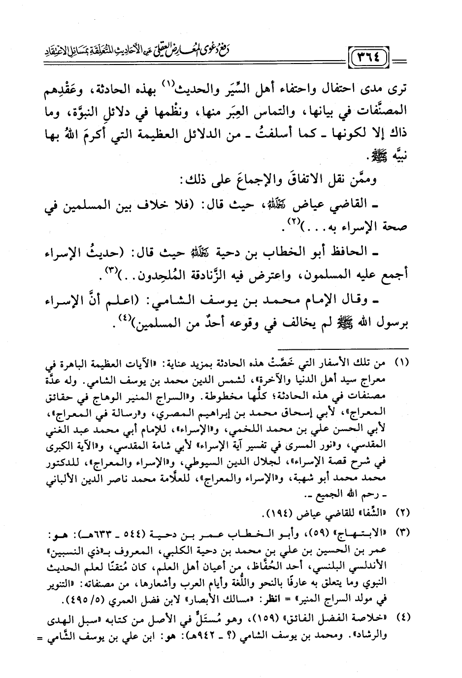 - الحافظ أبو الخطاب بن دحية - رحمه الله - حيث قال: (حديثُ الإسراء أجمع عليه المسلمون، واعترض فيه الزَّنادقة المُلحِدون .. ) (¬٣)