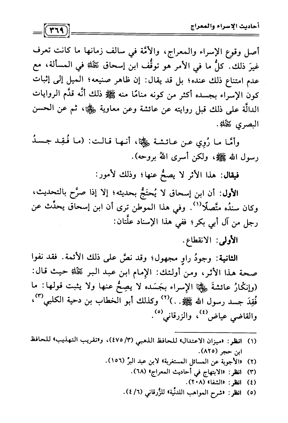الثانية: وجودُ راوٍ مجهول؛ وقد نصّ على ذلك الأئمة. فقد نفوا صحة هذا الأثر، ومن أولئك: الإِمام ابن عبدالبر - رحمه الله - حيث قال: (وإنكْارُ عائشةَ < الإِسراء بجَسَده لا يصِحُّ عنها ولا يثبت قولها: ما فُقِدَ جسد رسول الله - صلى الله عليه وسلم - .. ) (¬٢) وكذلك أبو الخطاب بن دحية الكلبي (¬٣)، والقاضي عياض (¬٤)، و الزرقاني. (¬٥)