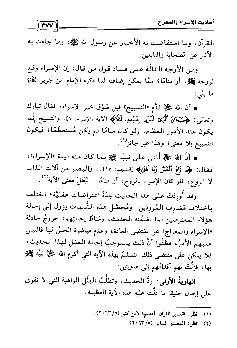 • أن الله جل جلاله قدّم " التسبيح " قبل سَوْق خبر الإسراء؛ فقال تبارك وتعالى: {سُبْحَانَ الَّذِي أَسْرَى بِعَبْدِهِ لَيْلًا} ... الآية. والتسبيح إِنَّما يكون عند الأمور العظام، ولو كان منامًا لم يكن مُستعظَمًا؛ فيكون التسبيح بلا معنى؛ وهذا غير جائز. (¬١)