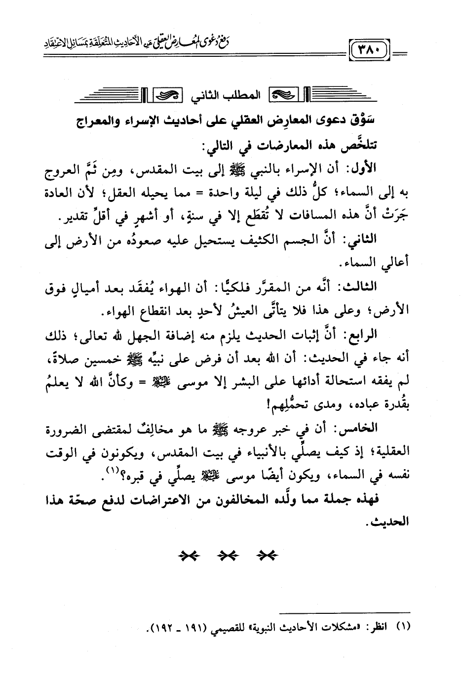 المطلب الثاني: سَوْق دعوى المعارِض العقلي على أحاديث الإسراء والمعراج.