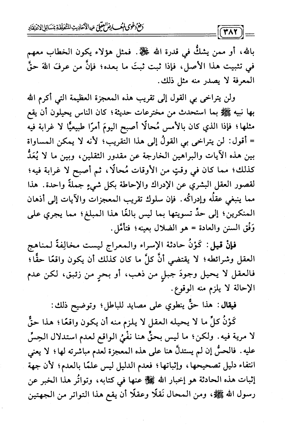 ولن يتراخى بي القول إلى تقريب هذه المعجزة العظيمة التي أكرم الله بها نبيه - صلى الله عليه وسلم - بما استحدث من مخترعات حديثة؛ كان الناس يحيلون أن يقع مثلها؛ فإذا الذي كان بالأمس مُحالًا أصبح اليومَ أمرًا طبعيًّا لا غرابة فيه = أقول: لن يتراخى بي القولُ إلى هذا التقريب؛ لأنه لا يمكن المساواة بين هذه الآيات والبراهين الخارجة عن مقدور الثقلين، وبين ما لا يُعَدُّ كذلك؛ مما كان في وقتٍ من الأوقات مُحالًا، ثم أصبح لا غرابة فيه؛ لقصور العقل البشري عن الإدراك والإحاطة بكل شيءٍ جملةً واحدة. هذا مما ينبغي عقلُه وإدراكُه. فإن سلوك تقريب المعجزات والآيات إلى أذهان المنكرين؛ إلى حدّ تسويتها بما ليس بالغًا هذا المبلغ؛ مما يجري على وَفْق السنن والعادة = هو الضلال بعينه؛ فتأمّل.