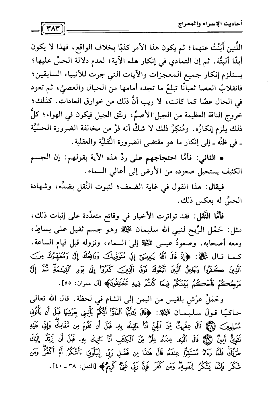 • الثاني: فأمّا احتجاجهم على ردّ هذه الآية بقولهم: إن الجسم الكثيف يستحيل صعوده من الأرض إلى أعالي السماء.