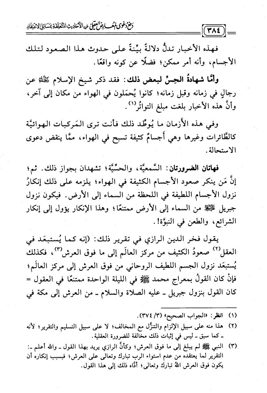 فهاتان الضرورتان: السَّمعيَّة، والحسّيَّة؛ تشهدان بجواز ذلك. ثم؛ إنّ مَن ينكر صعود الأجسام الكثيفة في الهواء؛ يلزمه على ذلك إنكارُ نزول الأجسام اللطيفة في اللحظة من السماء إلى الأرض. فيكون نزول جبريل - عليه السلام - من السماء إلى الأرض ممتنعًا؛ وهذا الإنكار يؤول إلى إنكار الشرائع، والطعن في النبوّة!.