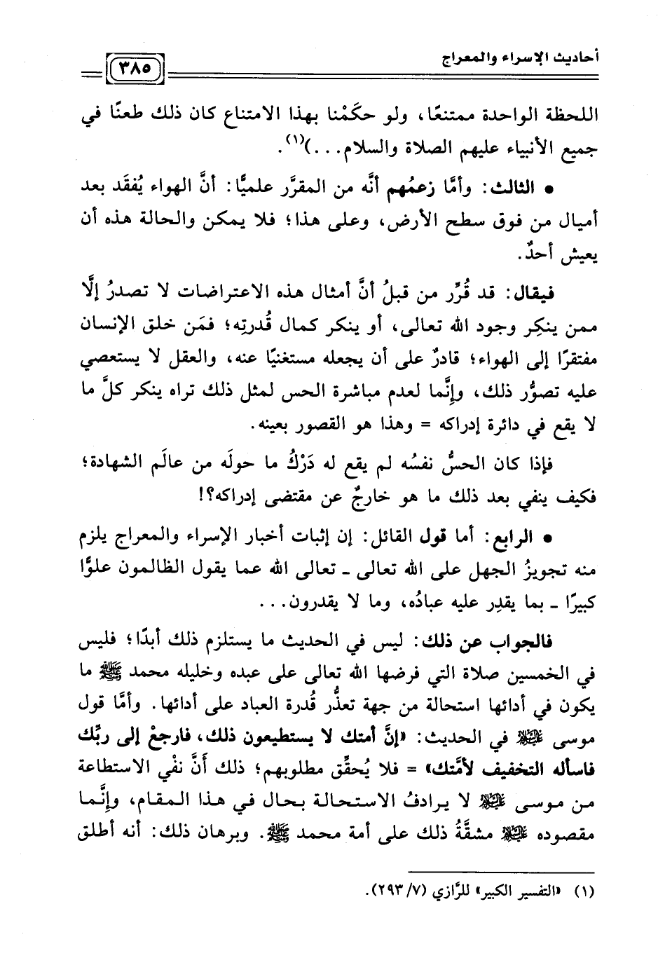 • الرابع: أما قول القائل: إن إثبات أخبار الإسراء والمعراج يلزم منها تجويزُ الجهل على الله تعالى - تعالى الله عما يقول الظالمون علوًّا كبيرًا - بما يقدِر عليه عبادُه، وما لا يقدرون ...