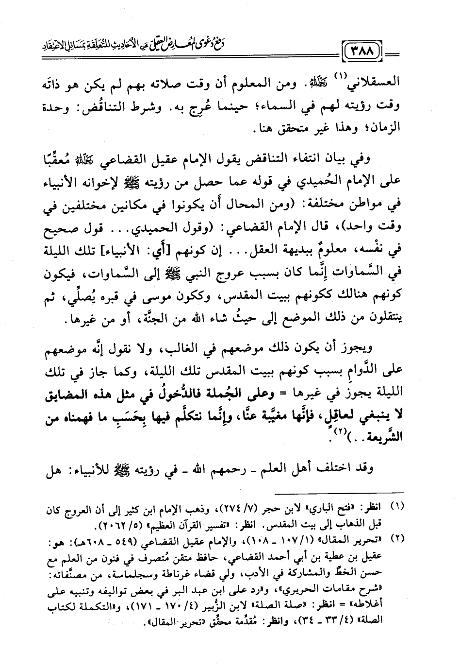 العسقلاني (¬١) - رحمه الله -. ومن المعلوم أن وقت صلاته بهم لم يكن هو ذاتُه وقت رؤيته لهم في السماء؛ حينما عُرِج به. وشرط التناقُض: وحدة الزمان؛ وهذا غير متحقق هنا.