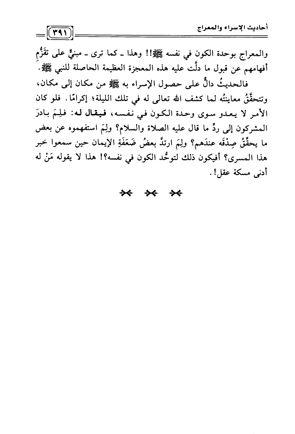 فالحديثُ دالٌّ على حصول الإسراء به - صلى الله عليه وسلم - من مكان إلى مكان، وتتحقّقُ معاينتُه لما كشف الله تعالى له في تلك الليلة؛ إكرامًا. فلو كان الأمر لا يعدو سوى وحدة الكون في نفسه، فيقال له: فلِمَ بادرَ المشركون إلى ردِّ ما قال عليه الصلاة والسلام؟ ولِمَ استفهموه عن بعض ما يحقِّقُ صِدْقَه عندَهم؟ ولِمَ ارتدَّ بعضُ ضَعَفَةِ الإيمان حين سمعوا خبر هذا المسرى؟ أفيكون ذلك لتوحُّد الكون في نفسه؟! هذا لا يقوله مَنْ له أدنى مسكة عقل!.