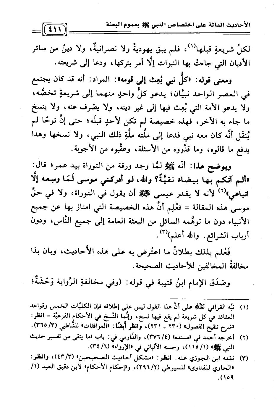 ويوضح هذا: أنّه - صلى الله عليه وسلم - لمّا وجد ورقة من التوراة بيد عمر؛ قال: (ألم آتكم بها بيضاءَ نقيّةً؟ والله، لو أدركني موسى لَمَا وسِعه إلاّ اتباعي) (¬١) لأنه لا يقدر عيسى - - عليه السلام - - أن يقول في التوراة، ولا في حقّ موسى هذه المقالة = فعُلِم أنّ هذه الخصيصة التي امتاز بها عن جميع الأنبياء دون ما توهّمه السائل من البعثة العامة إلى جميع النّاس، ودون أرباب الشرائع. والله أعلم) (¬٢)