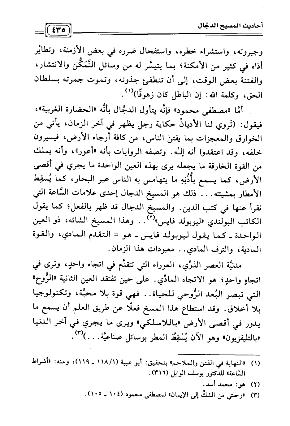 أمّا " مصطفى محمود " فإنّه يتأول الدجّال بأنّه " الحضارة الغربية "، فيقول: (تَروي لنا الأديانُ حكاية رجل يظهر في آخر الزمان، يأتي من الخوارق والمعجزات ما يفتن الناس، من كافة أرجاء الأرض، فيسيرون خلفه، وقد اعتقدوا أنه إله. وتصفه الروايات بأنه "أعور"، وأنه يملك من القوة الخارقة ما يجعله يرى بهذه العين الواحدة ما يجري في أقصى الأرض، كما يسمع بأُذُنِهِ ما يتهامس به الناس عبر البحار، كما يُسقِط الأمطار بمشيئته ... ذلك هذا المسيخ الدجال إحدى علامات السَّاعة التي نقرأ عنها في كتب الدين. والمسيخ الدجال قد ظهر بالفعل؛ كما يقول الكاتب البولندي " ليوبولد فايس" (¬٢) .. وهذا المسخ الشائه، ذو العين الواحدة - كما يقول ليوبولد فايس - هو = التقدم المادي، والقوة المادية، والترف المادي .. معبودات هذا الزمان.
