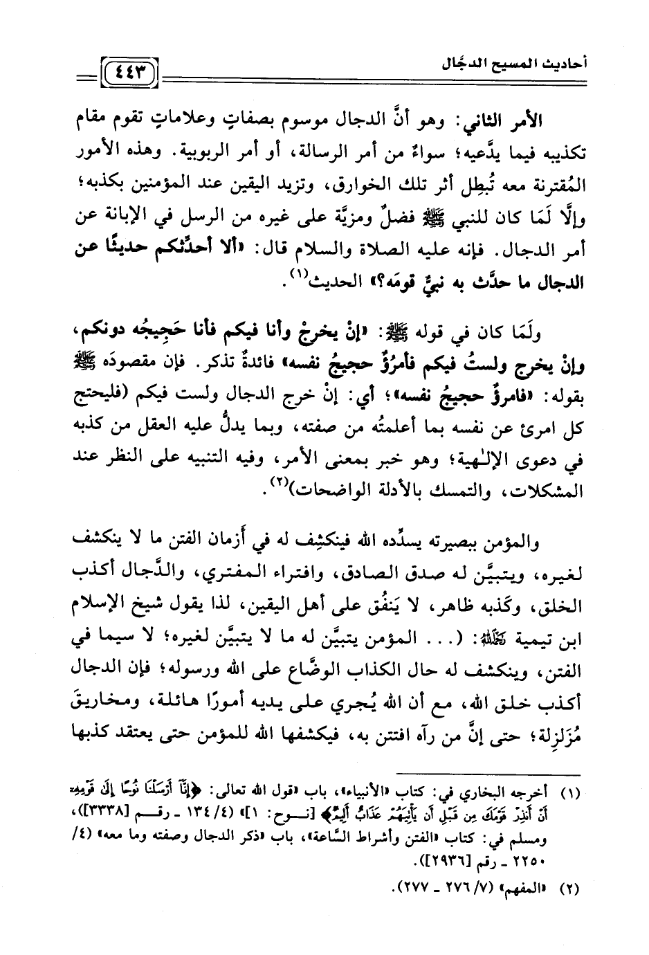 ولَمَا كان في قوله - صلى الله عليه وسلم -: (إنْ يخرجْ وأنا فيكم فأنا حجيجه دونكم، وإنْ يخرج ولستُ فيكم فأمرُؤٌ حجيجُ نفسه) فائدةٌ تذكر. فإن مقصودَه - صلى الله عليه وسلم - بقوله: (فامرؤٌ حجيجُ نفسه) أي: إنْ خرج الدجال ولست فيكم (فليحتج كل امرئ عن نفسه بما أعلمتُه من صفته، وبما يدلّ عليه العقل من كذبه في دعوى الإلهية؛ وهو خبر بمعنى الأمر، وفيه التنبيه على النظر عند المشكلات، والتمسك بالأدلة الواضحات) (¬٢) .