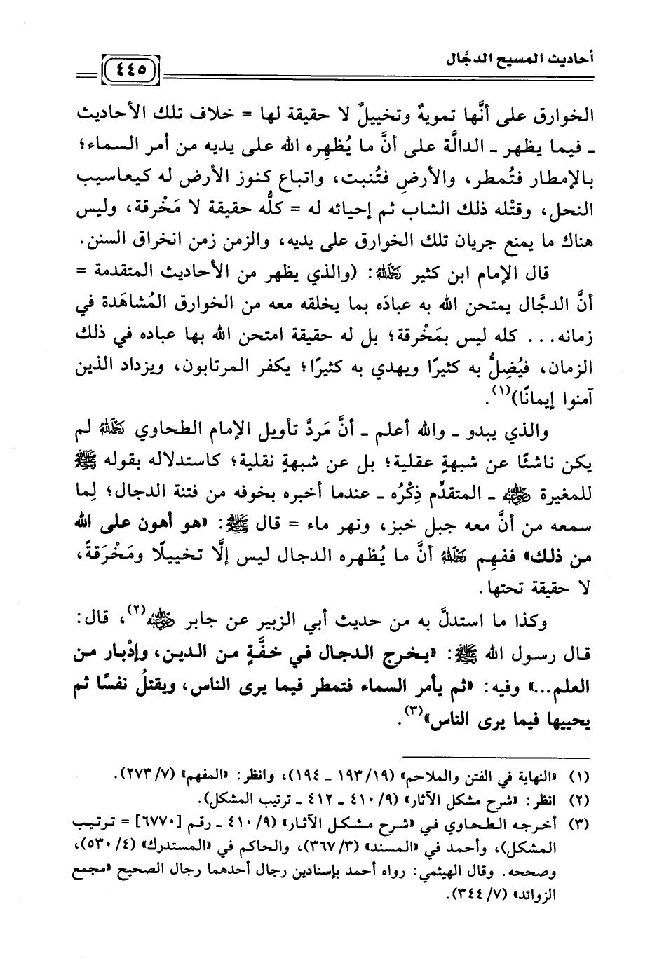 الخوارق بأنّها تمويهٌ وتخييلٌ لا حقيقة لها = تردّه تلك الأحاديث البيِّنة الدالّة على أنّ ما يُظهِره الله على يديه من أمر السماء؛ بالإمطار فتُمطر، والأرضِ فتُنبت، واتباع كنوز الأرض له كيعاسيب النحل، وقتْله ذلك الشاب ثم إحيائه له = كلّه حقيقة لا مَخْرقة، وليس هناك ما يمنع جريان تلك الخوارق على يديه، والزمن زمن انخراق السنن.