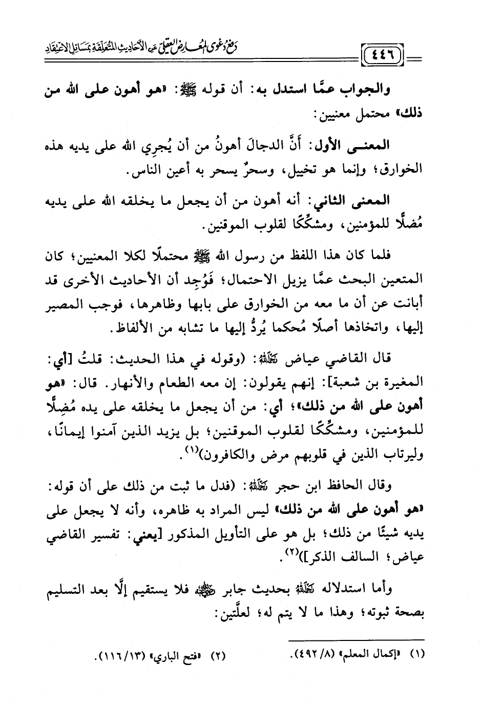 قال القاضي عياض - رحمه الله -: (وقوله في هذا الحديث: قلتُ [أي: المغيرة بن شعبة]: إنهم يقولون: إن معه الطعام والأنهار. قال: (هو أهون على الله من ذلك) أي: من أن يجعل ما يخلقه على يده مُضِلًا للمؤمنين، ومشكِّكًا لقلوب الموقنين؛ بل يزيد الذين آمنوا إيمانًا، وليرتاب الذين في قلوبهم مرض والكافرون) (¬١) .