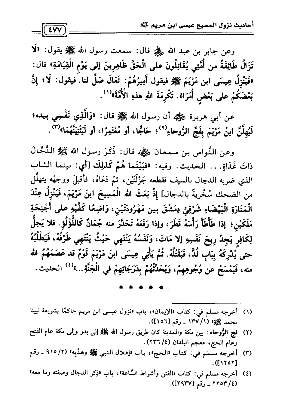 وعن النَّواس بن سمعان - رضي الله عنه - قال: ذَكَرَ رسول الله - صلى الله عليه وسلم - الدَّجَّالَ ذاتَ غَدَاةٍ ... الحديث. وفيه: (فبَيْنَما هُمْ كَذلِكَ [أي بينما الشاب الذي ضربه الدجال بالسيف فقطعه جَزْلَتَيْن، ثمّ دَعَاهُ، فأقبلَ ووجهُه يتهلّل من الضحك سُخْريةً بالدجال] إِذْ بَعَثَ الله الْمَسِيحَ ابنَ مَرْيَمَ، فَيَنْزِلُ عِنْدَ الْمَنَارَةِ الْبَيْضَاءِ شَرْقِيَّ دِمَشْقَ بين مَهْرُودَتَيْنِ، وَاضِعًا كَفَّيْهِ على أَجْنِحَةِ مَلَكَيْنِ؛ إذا طَأْطَأَ رَأْسَهُ قَطَرَ، وإذا رَفَعَهُ تَحَدَّرَ منه جُمَانٌ كَاللُّؤْلُؤِ. فلا يَحِلُّ لِكَافِرٍ يَجِدُ رِيحَ نَفَسِهِ إلا مَاتَ، وَنَفَسُهُ يَنْتَهِي حَيْثُ يَنْتَهِي طَرْفُهُ، فَيَطْلُبُهُ حتى يُدْرِكَهُ بِبَابِ لُدٍّ، فَيَقْتُلُهُ. ثُمَّ يَأْتِي عِيسَى ابنَ مَرْيَمَ قَوْمٌ قد عَصَمَهُمْ الله منه، فَيَمْسَحُ عن وُجُوهِهِمْ، وَيُحَدِّثُهُمْ بِدَرَجَاتِهِمْ في الْجَنَّةِ ... ) (¬٤) الحديث.