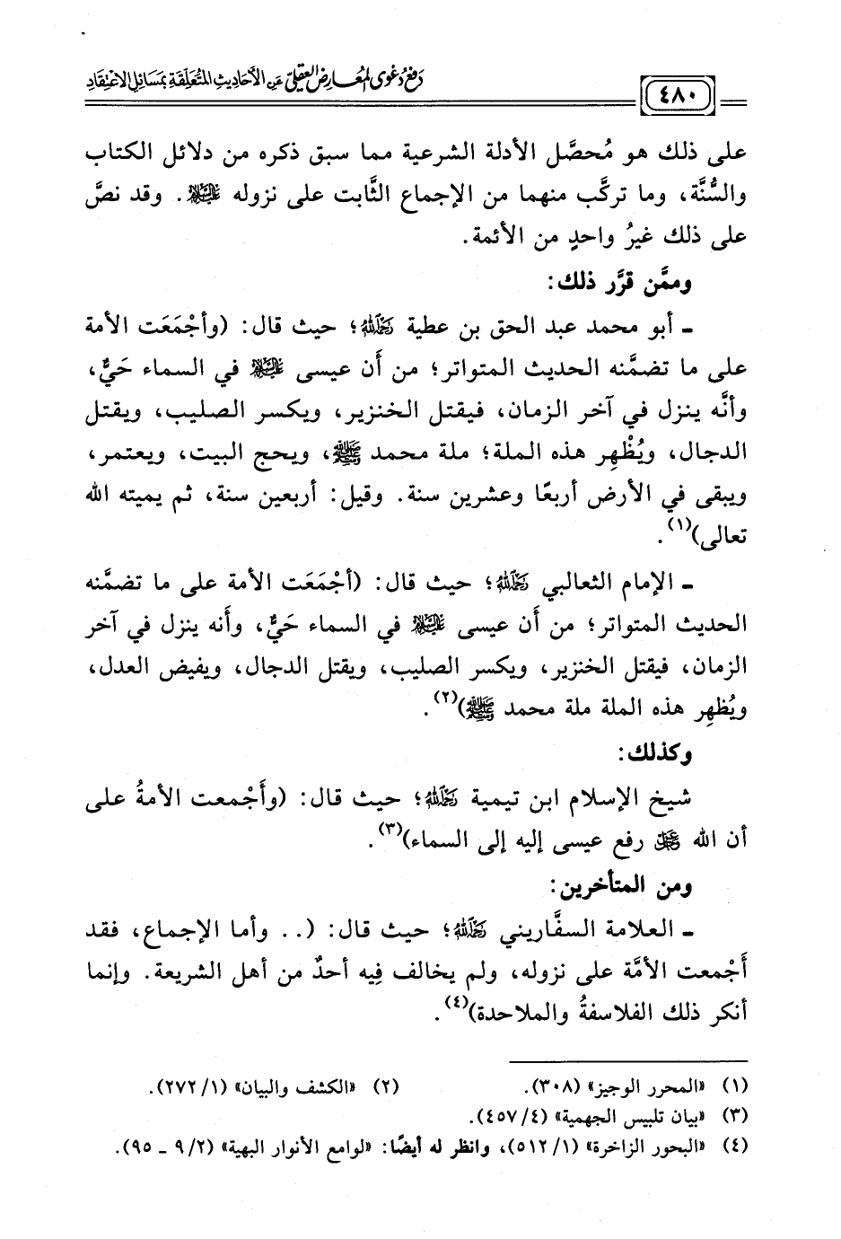 - العلامة السفَّاريني ـ - رحمه الله - ـ؛ حيث قال: « .. وأما الإجماع , فقد أَجْمعت الأمّة على نزوله , ولم يخالف فِيْه أحدٌ من أهل الشريعة. وإنما أنكر ذلك الفلاسفةُ والملاحدة» (¬٤) .