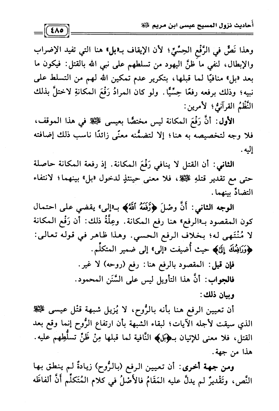 وهذا نَصٌّ في الرَّفْعِ الحِسِّيّ؛ لأن الإيقاف ... بـ (بل) هنا التي تفيد الإضراب والإبطال، لنفي ما ظنّ اليهود من تسلطهم على نبي الله بالقتل: فيكون ما بعد " بل " منافيًا لما قبلها، بتكرير عدم تمكين الله لهم من التسلط على نبيه؛ وذلك برفعه رفعًا حِسِّيًا. ولو كان المرادُ رَفْعَ المكانةِ لاختلّ بذلك النّظْمُ القرآنيُّ؛ لأمرين: