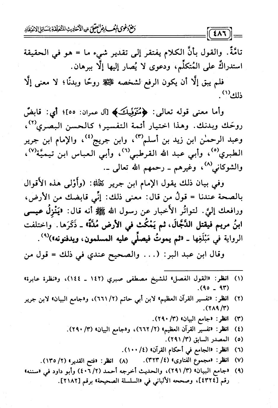 وفي بيان ذلك يقول الإمام ابن جرير ـ - رحمه الله - ـ: «وأَوْلى هذه الأَقوال بالصحة عندنا = قولُ من قال: معنى ذلك: إنّي قابضك من الأرض، ورافعك إليّ. لتواتُر الأَخبار عن رسول الله - صلى الله عليه وسلم - أنه قال: (يَنْزِلُ عيسى ابنُ مريم فيقتل الدَّجَّالَ، ثم يَمْكُث في الأرض مُدّةً) - ذَكَرَها. واختلفت الرواية في مَبْلَغِها - ثم يموتُ فيصلِّي عليه المسلمون , ويدفنونه)» (¬٩) .