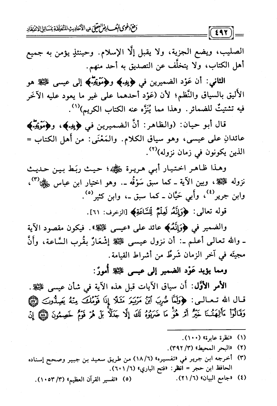 وهذا ظاهر اختيار أبي هريرة ـ - رضي الله عنه - ـ؛ حيث ربَط بين حديث نزوله - عليها السلام -، وبين الآية ـ كما سبق سَوْقُه ـ. وهو اختيار ابن عباس ـ - رضي الله عنها - ـ (¬٣)، وابن جرير (¬٤) , وأَبي حَيَّان ـ كما سبق ـ , وابن كثير (¬٥) .
