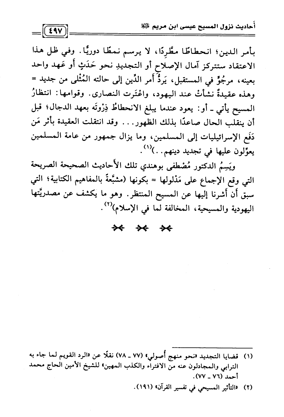 ويَسِمُ الدكتور مُصْطفى بو هندي تلك الأَحاديث الصحيحة الصريحة التي وقع الإجماع على مَدْلولها = بكونها «مشبّعةً بالمفاهيم الكتابية؛ التي سبق أَن أَشرنا إليها عن المسيح المنتظر. وهو ما يكشف عن مصدريّتها اليهودية والمسيحية، المخالفة لما في الإسلام» (¬٢).