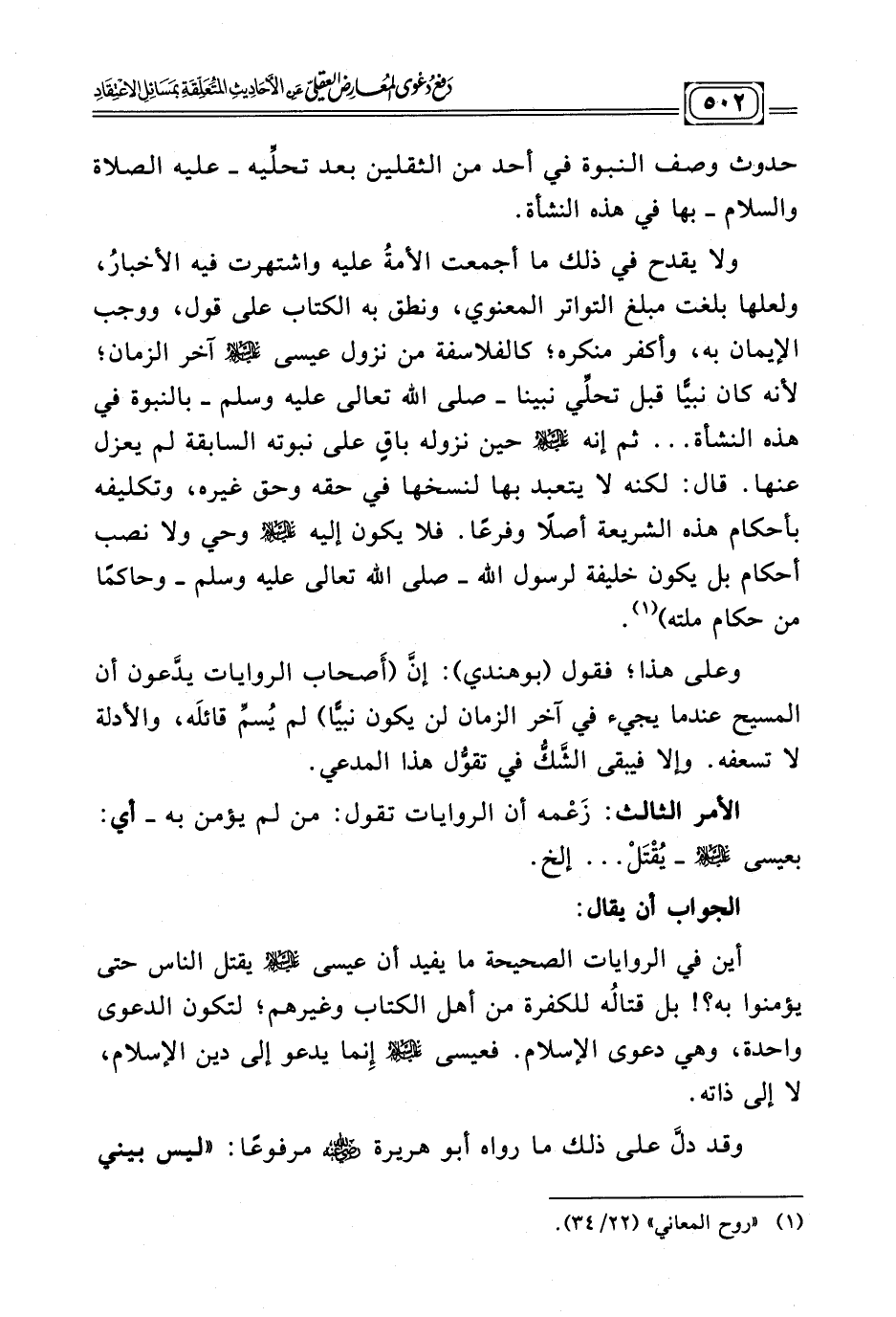 ولا يقدح في ذلك ما أجمعت الأمة عليه واشتهرت فيه الأخبار، ولعلها بلغت مبلغ التواتر المعنوي، ونطق به الكتاب على قول، ووجب الإيمان به، وأكفر منكره؛ كالفلاسفة من نزول عيسى - عليه السلام - آخر الزمان؛ لأنه كان نبيا قبل تحلِّي نبينا -صلى الله تعالى عليه وسلم- بالنبوة في هذه النشأة ... ثم أنه - عليه السلام - حين نزوله باقٍ على نبوته السابقة لم يعزل عنها. قال: لكنه لا يتعبد بها لنسخها في حقه وحق غيره، وتكليفه بأحكام هذه الشريعة أصلًا وفرعًا. فلا يكون إليه - عليه السلام - وحي ولا نصب أحكام بل يكون خليفة لرسول الله -صلى الله تعالى عليه وسلم- وحاكما من حكام ملته) . (¬١)