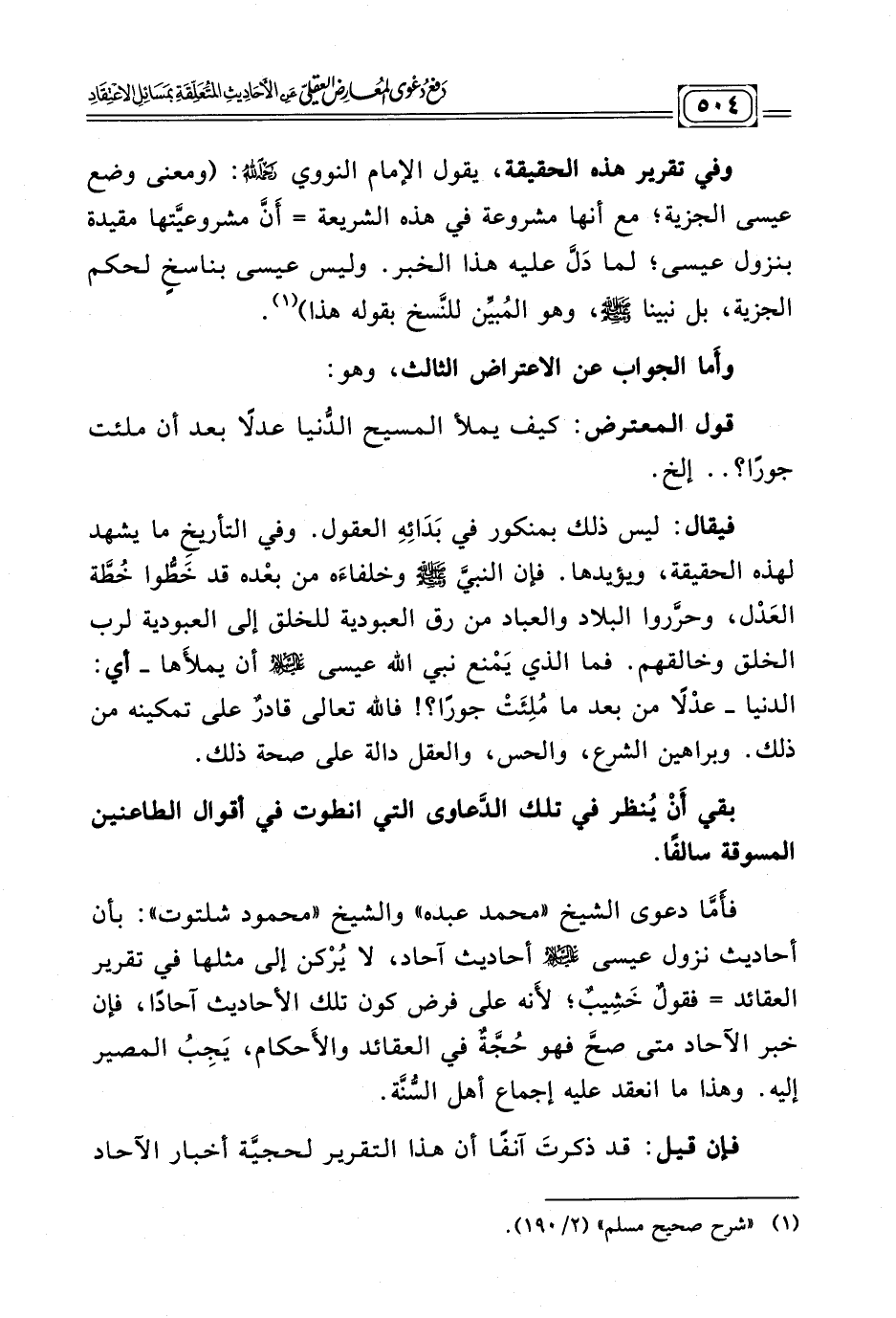فأَمّا دعوى الشيخ " محمد عبده " والشيخ " محمد شلتوت ": بأن أحاديث نزول عيسى - عليها السلام - أحاديث آحاد، لا يُرْكن إلى مثلها في تقرير العقائد = فقولٌ خَشِيبٌ؛ لأَنه على فرض كون تلك الأحاديث آحاد , فإن خبر الآحاد متى صحّ فهوحُجّةٌ في العقائد والأَحكام، يَجِبُ المصير إليه. وهذا ما انعقد عليه إجماع أهل السُّنة.