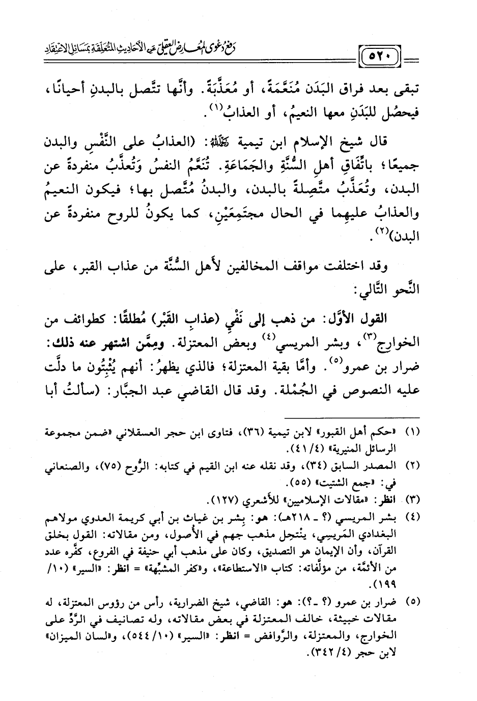 القول الأوَّل: من ذهب إلى نَفْيِ (عذابِ القَبْر) مُطلقًا: كطوائف من الخوارِج (¬٣)، وبشر المريسي (¬٤) وبعضُ المعتزلة. ومِمّن اشتهر عنه ذلك: ضرار بن عمرو (¬٥) . وأمّا بقية المعتزلة؛ فالذي يظهرُ: أنهم يُثْبِتُون ما دلّت عليه النصوص في الجُمْلة. وقد قال القاضي عبد الجبّار: (سألتُ أبا