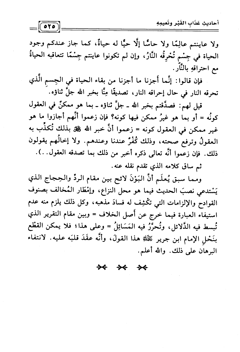 قيل لهم: فصدَّقتم بخبر الله -جلَّ ثناؤه -بما هو ممكنٌ في العقول كونُه=أو بما هو غيرُ ممكن فيها كونه؟ فإن زعموا أنَّهم أجازوا ما هو غير ممكن في العقول كونه =زعموا أنَّ خبر الله عزَّ وجلَّ بذلك تُكذِّب به العقولُ وترفع صحته، وذلك كُفْرٌ عندنا وعندهم. ولا إخالهم يقولون ذلك. فإن زعموا أنّه تعالى ذكره أخبر من ذلك بما تصدقه العقول .. ) .