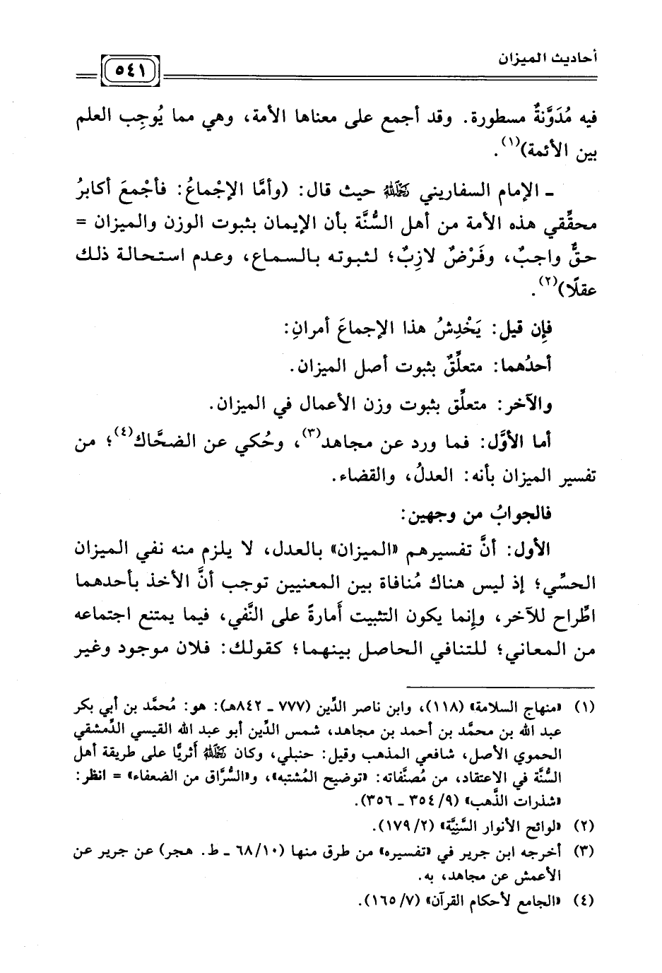 - الإمام السفاريني - رحمه الله - حيث قال: (وأمّا الإجْماعُ: فأجْمعَ أكابرُ محقّقي الأمة من أهل السُّنة بأن الإيمان بثبوت الوزن، والميزان = حقٌّ واجبٌ، وفَرْضٌ لازِبٌ؛ لثبوته بالسماع، وعدم استحالة ذلك عقلًا) (¬٢) .