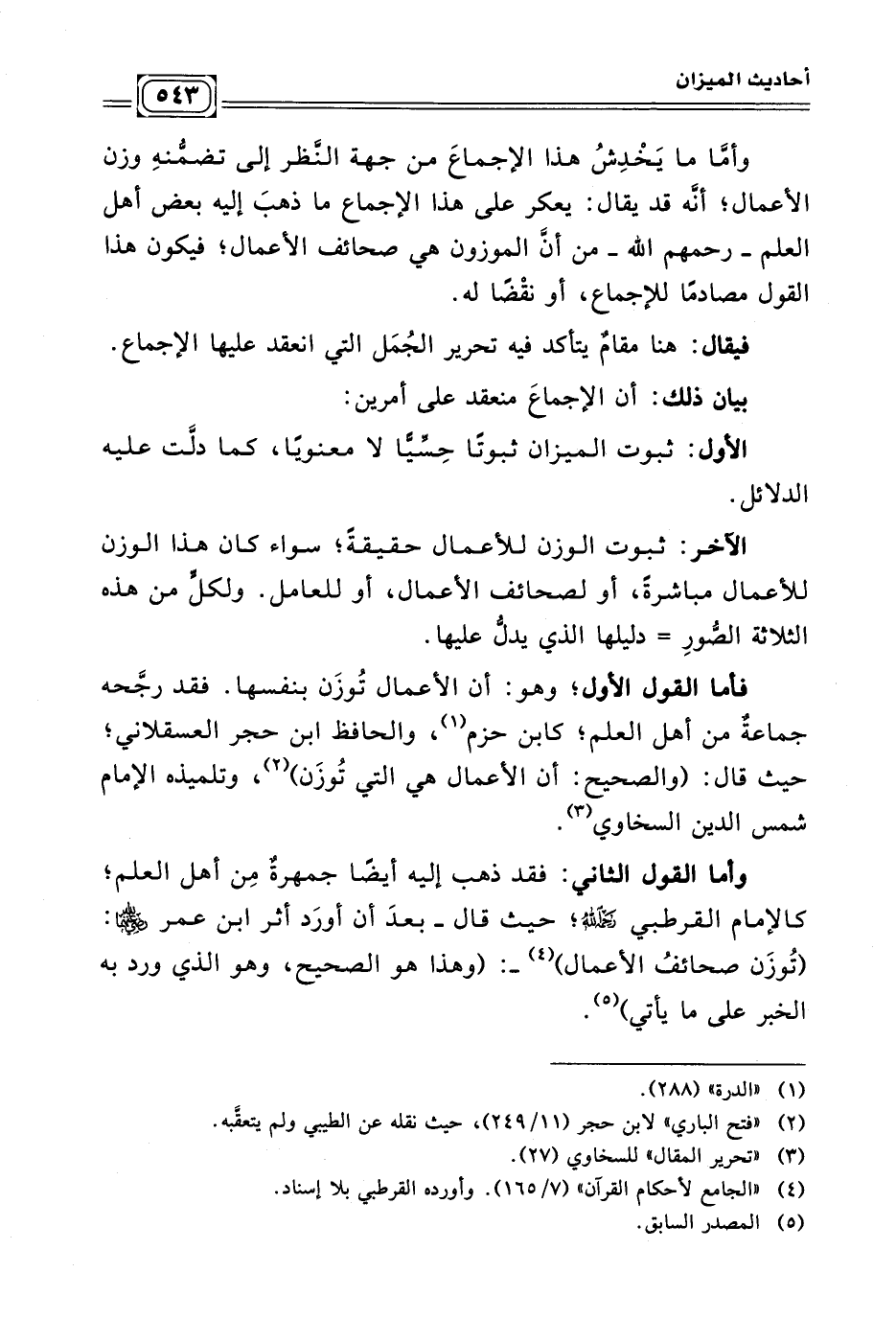 الآخر: ثبوت الوزن للأعمال حقيقةً؛ سواءً كان هذا الوزن للأعمال مباشرةً، أو لصحائف الأعمال، أو للعامل. ولكلٍّ من هذه الثلاثة الصُّورِ =دليلها الذي يدلّ عليها.