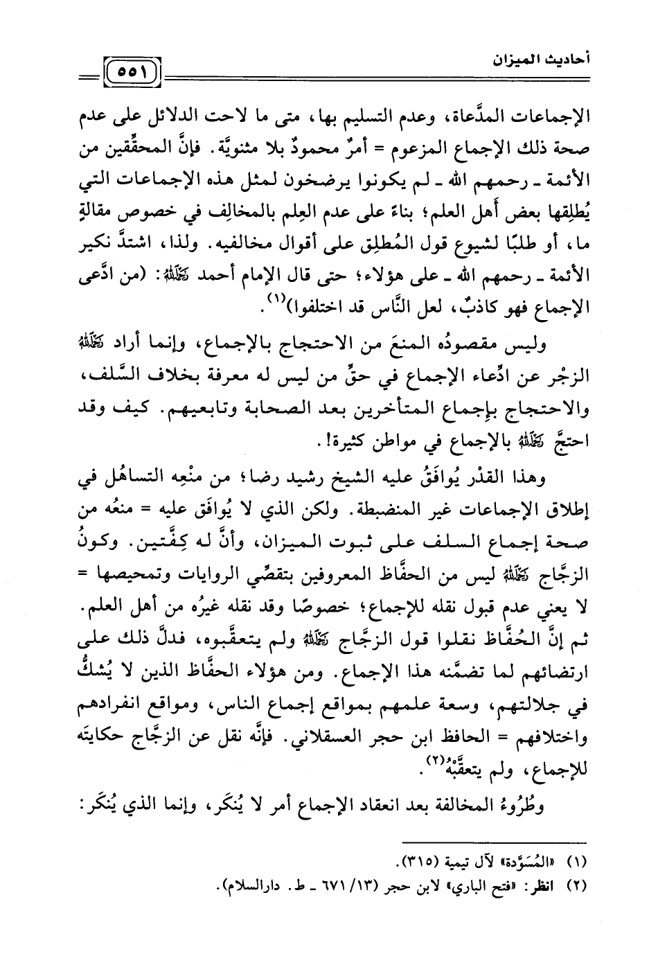 وهذا القدْر يُوافَقُ عليه الشيخ رشيد رضا؛ من منْعِه التساهُل في إطلاق الإجماعات غير المنضبطة. ولكن الذي لا يُوافَق عليه = منعُه من صحة إجماع السلف على ثبوت الميزان، وأنّ له كِفّتين. وكونُ الزجّاج - رحمه الله - ليس من الحفّاظ المعروفين بتقصّي الروايات وتمحيصها = لا يعني عدم قبول نقله للإجماع؛ خصوصًا وقد نقله غيرُه من أهل العلم. ثم إنّ الحُفّاظ نقلوا قول الزجّاج - رحمه الله - ولم يتعقّبوه، فدلّ ذلك على ارتضائهم لما تضمّنه هذا الإجماع. ومن هؤلاء الحفّاظ الذين لا يُشكُّ في جلالتهم، وسعة علمهم بمواقع إجماع الناس، ومواقع انفرادهم واختلافهم = الحافظ ابن حجر العسقلاني. فإنّه نقل عن الزجّاج حكايتَه للإجماع، ولم يتعقّبْهُ (¬٢) .
