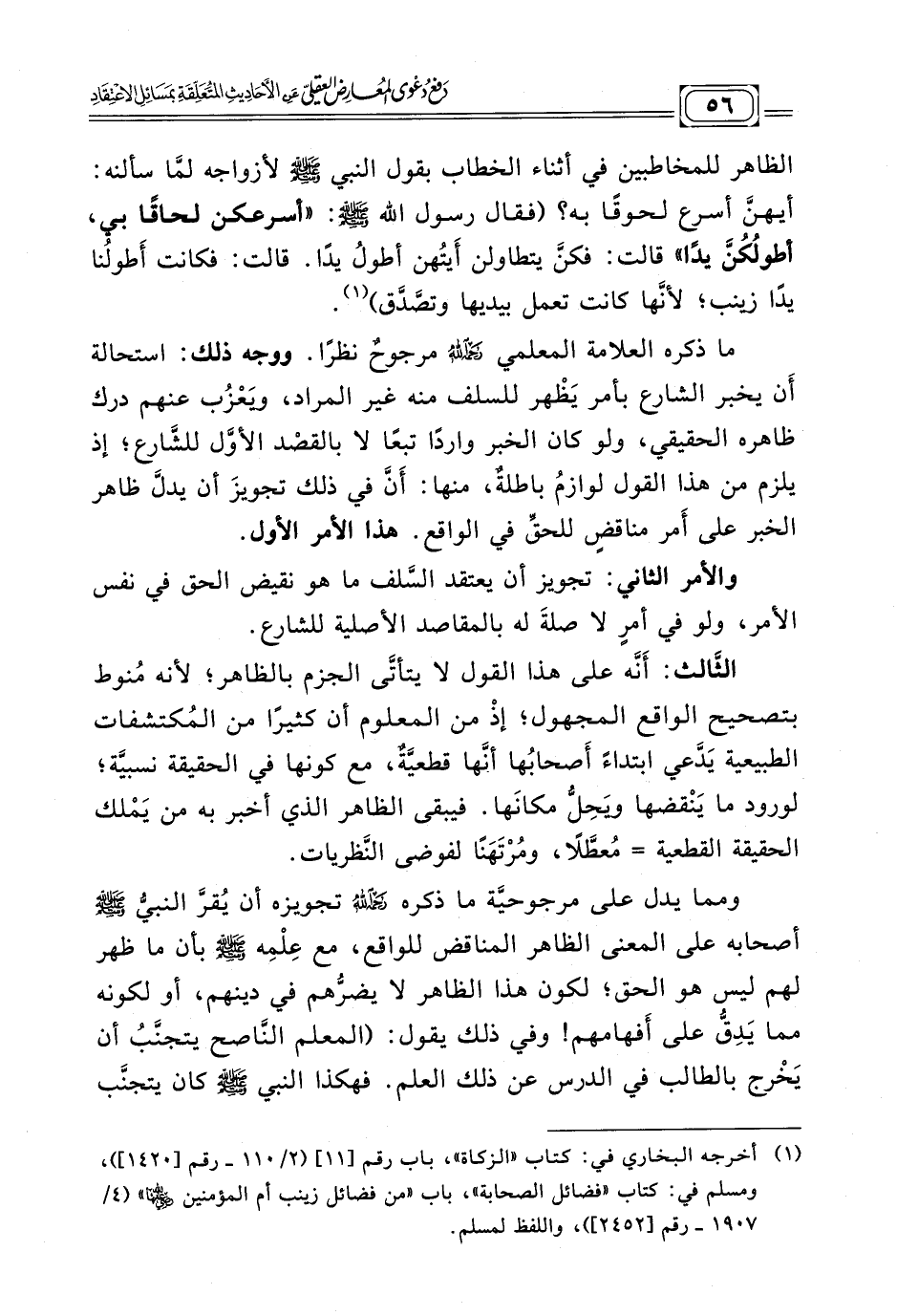 ما ذكره العلامة المعلمي - رحمه الله - مرجوحٌ نظرًا. ووجه ذلك: استحالة أَن يخبر الشارع بأمر يَظْهر للسلف منه غير المراد، ويَعْزُب عنهم درك ظاهره الحقيقي، ولو كان الخبر وارادًا تبعًا لا بالقصْد الأوَّل للشَّارع؛ إذ يلزم من هذا القول لوازمُ باطلةٌ، منها: أَنَّ في ذلك تجويزَ أن يدلّ ظاهر الخبر على أَمر مناقضٍ للحقِّ في الواقع. هذا الأمر الأول.