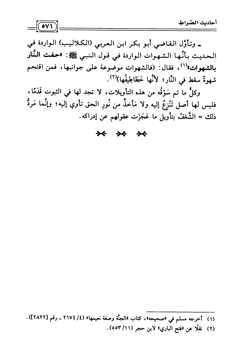 - وتأوَّل القاضي أَبو بكر بن العربي (الكلاليب) الواردة في الحديث بأنَّها الشهوات الواردة في قول النبي - صلى الله عليه وسلم -: (حفت النَّار بالشهوات) (¬٥)، فقال: (فالشهوات موضوعة على جوانبها، فمن اقتحم شهوةً سقط في النّار؛ لأنَّها خَطَاطِيفُها) (¬٦).