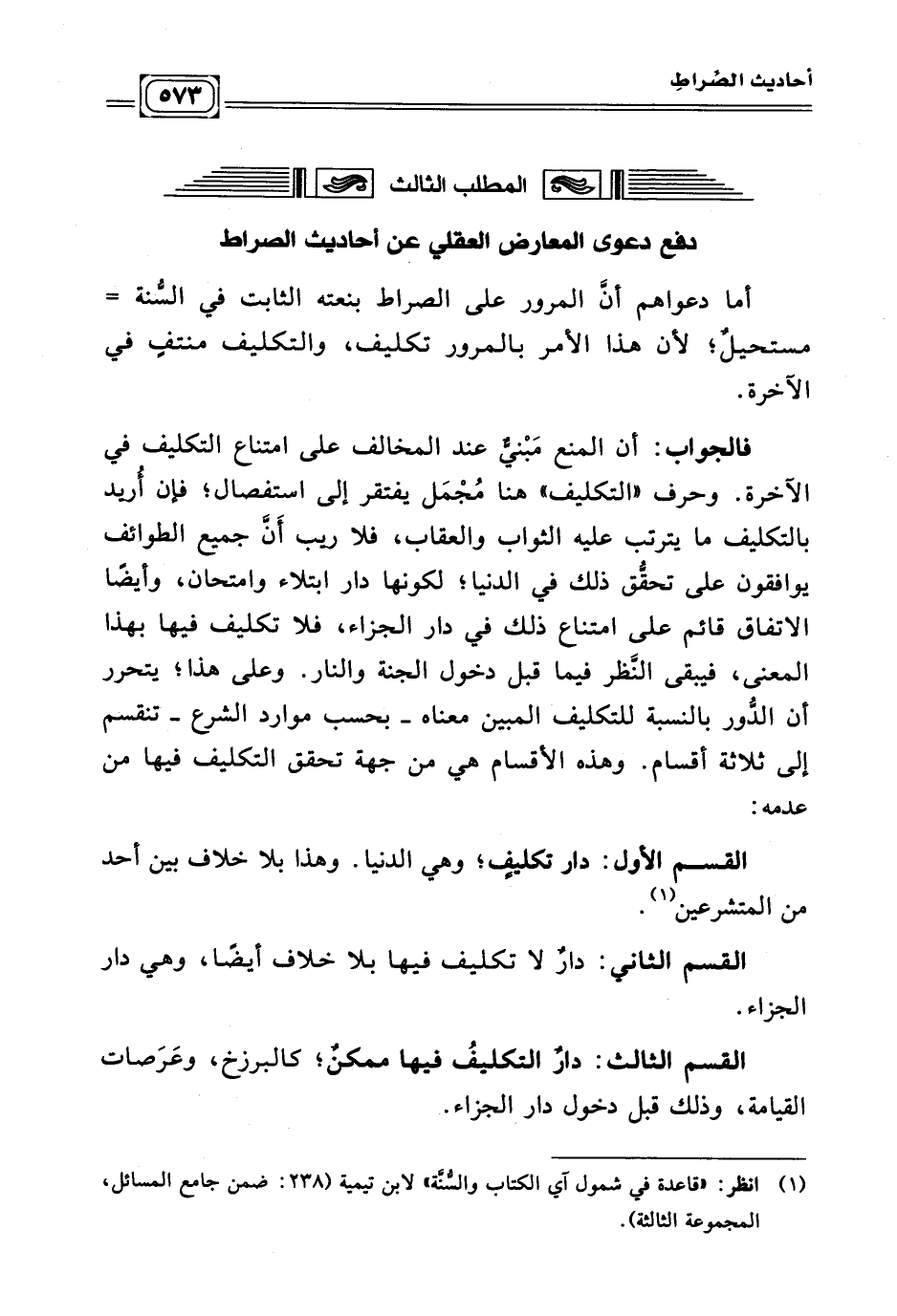 أما دعواهم أنَّ المرور على الصراط بنعته الثابت في السُّنة= مستحيلٌ؛ لأن هذا الأمر بالمرور تكليف والتكليف منتفٍ في الآخرة.