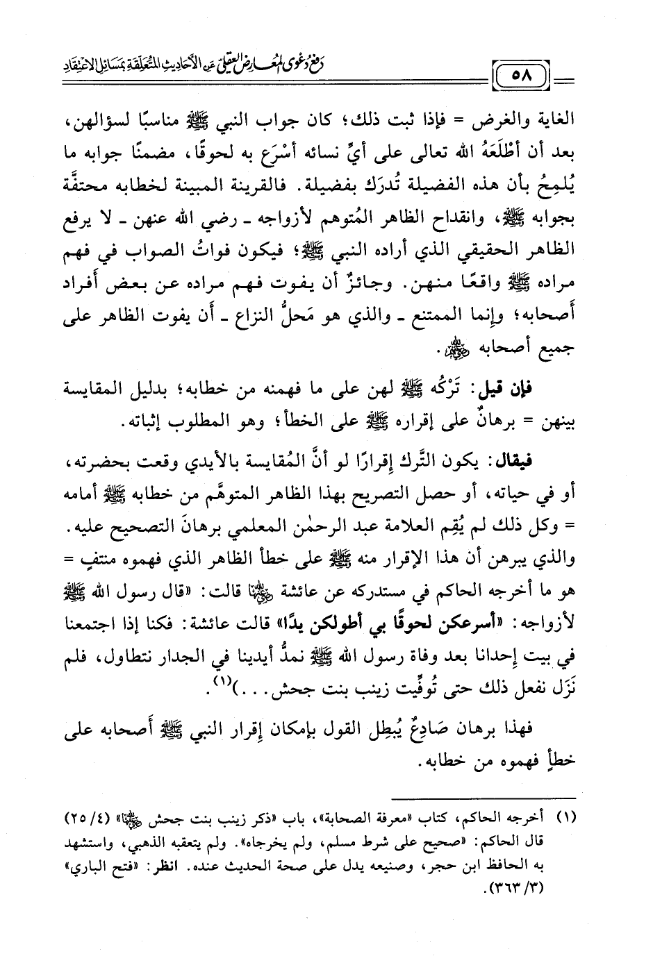 فيقال: يكون التَّرك إِقرارًا لو أنَّ المُقايسة بالأيدي وقعت بحضرته، أو في حياته، أو حصل التصريح بهذا الظاهر المتوهَّم من خطابه - صلى الله عليه وسلم - أمامه = وكل ذلك لم يُقِم العلامة عبد الرحمن المعلمي برهانَ التصحيح عليه. والذي يبرهن أن هذا الإقرار منه - صلى الله عليه وسلم - على خطأ الظاهر الذي فهموه منتفٍ = هو ما أخرجه الحاكم في مستدركه عن عائشة - رضي الله عنها - قالت: "قال رسول الله - صلى الله عليه وسلم - لأزواجه: (أسرعكن لحوقًا ... بي أطولكن يدًا) قالت عائشة: فكنا إذا اجتمعنا في بيت إِحدانا بعد وفاة رسول الله - صلى الله عليه وسلم - لنمدُّ أيدينا في الجدار نتطاول، فلم نَزَل نفعل ذلك حتى تُوفّيت زينب بنت جحش ... ) (¬١)